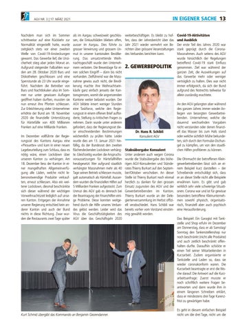 Covid-19-Aktivitäten und Ausblick Der erste Teil des Jahres 2020 war stark geprägt durch die CoronaMassnahmen. Auch seitens des AGV wurde hinsichtlich der Regelungen betreffend Covid-19 stark Einfluss genommen. Ziel war während der ganzen Zeit, die Auswirkungen auf das Gewerbe mehr oder weniger verträglich zu halten. Dies war nicht immer erfolgreich, da sich der Bund aufgrund des Notrechts teilweise für allein zuständig erachtete. An den AGV gelangten aber während des ganzen Jahres immer wieder Anliegen von besorgten Gewerbetreibenden. Unternehmer, welche die dauernd wechselnden Vorgaben nicht verstanden oder denen finanziell das Wasser bis zum Hals stand oder welche sichtlich Mühe bekundeten, sich durch den Formular-Dschungel zu kämpfen, um von den staatlichen Hilfen profitieren zu können. Die Ohnmacht der betroffenen Kleingewerbetreibenden lässt sich an einem Beispiel kurz darstellen – der Schreibende entschuldigt sich, dass er an dieser Stelle nicht alle Beispiele erwähnen kann. Es gibt und gab wirklich sehr viele schwierige Situationen. Corona war und ist für gewisse besonders betroffene Kleinunternehmen sowohl physisch, organisatorisch, finanziell aber auch psychisch eine Herausforderung. Das Beispiel: Ein Garagist mit Tankstelle und Shop erfuhr im Dezember am Donnerstag, dass er ab Samstag/ Sonntag den Tankenstellenshop nur noch beschränkt (nicht alle Produkte) und auch zeitlich beschränkt offenhalten durfte. Daraufhin schickte er einen Teil seiner Mitarbeitenden in Kurz arbeit. Zudem organisierte er Tankstelle und Laden so, dass sie wieder coronakonform waren. Die Kurzarbeit beantragte er erst die Woche darauf. Die Antwort auf die Kurzarbeitsanfrage: Zuerst musste er noch schriftlich weitere Fragen beantworten und dann wurde ihm in einem längeren Schreiben erklärt, dass er mindestens drei Tage Karenzfrist zu gewärtigen h abe. Es geht in diesem einfachen Beispiel nicht um die drei Tage, nicht um die