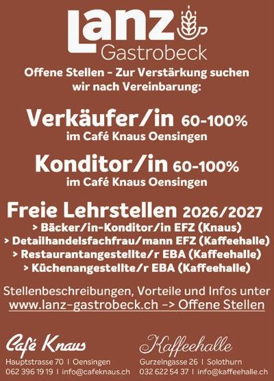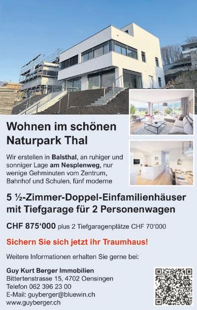 Anzeiger Thal Gäu Olten Auflage: 49 855 Exemplare WEMF-beglaubigt 2025 Erscheint wöchentlich, jeweils am Donnerstag Amtliches Publikationsorgan der Gemeinden: Aedermannsdorf, Balsthal, Boningen, Egerkingen, Fulenbach, Gunzgen, Hägendorf, Härkingen, Herbetswil, Holderbank, Kappel, Kestenholz, Laupersdorf, Matzendorf, Mümliswil-Ramiswil, Neuendorf, Niederbuchsiten, Oensingen, Oberbuchsiten, Olten, Rickenbach, Seehof, Wangen bei Olten, Welschenrohr-Gänsbrunnen, Wolfwil Nicht amtlich: Langenbruck/Bärenwil, Niederbipp, Oberbipp, Wolfisberg, Trimbach, Hauenstein-Ifenthal, Wisen SO, Winznau, Starrkirch-Wil