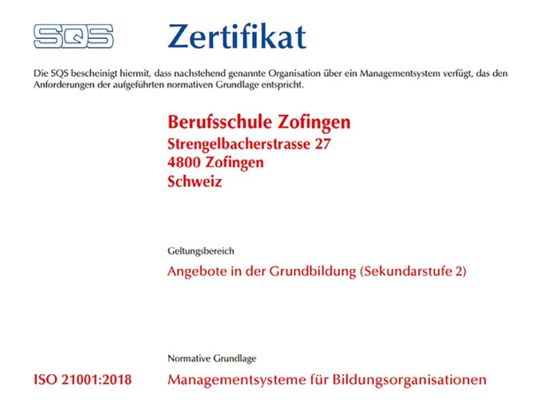 Im April 2025 überprüfte Franziska Wey als externe Auditorin der Schweizerischen Vereinigung für Qualitäts- und Managementsysteme SQS die BS Zofingen während eines eintägigen Aufrechterhaltungsaudits vor Ort auf die Normen-Konformität. Die Überprüfung ergab keinerlei Haupt- oder Nebenabweichungen zur ISO-Norm 21001:2018.