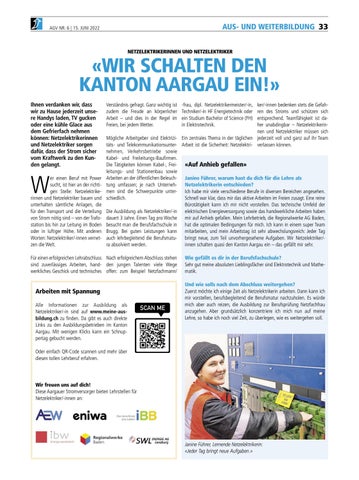 Arbeiten mit Spannung Alle Informationen zur Ausbildung als Netzelektriker/-in sind auf www.meine-ausbildung.ch zu finden. Da gibt es auch direkte Links zu den Ausbildungsbetrieben im Kanton Aargau. Mit wenigen Klicks kann ein Schnup pertag gebucht werden.