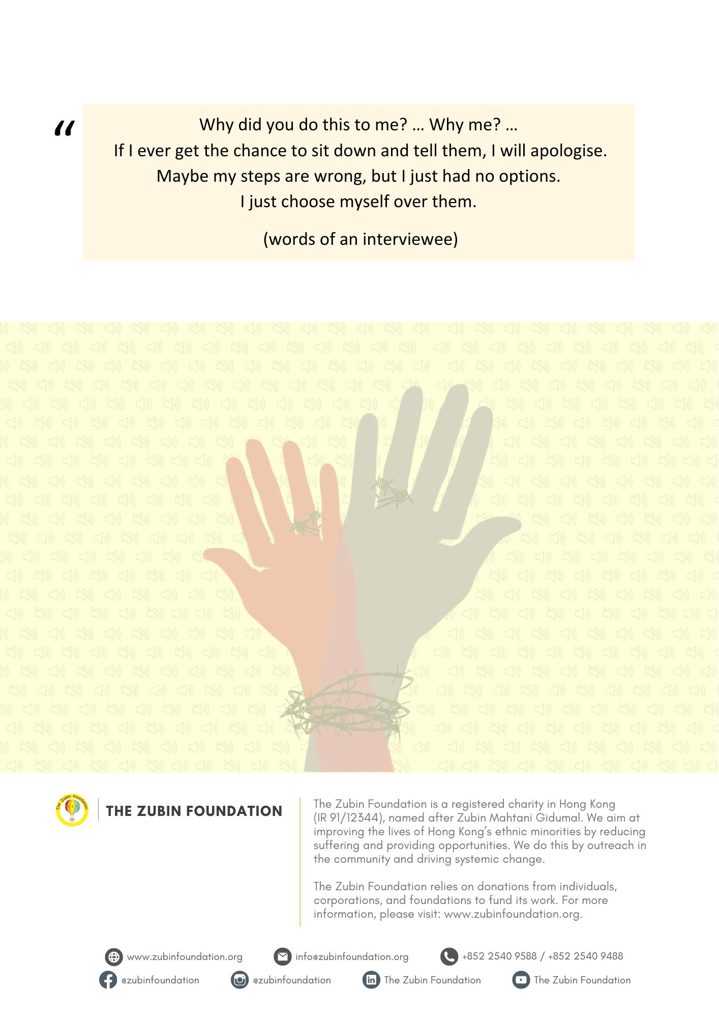 Forced marriage is a complex and global issue. Hong Kong is not exempt from this practice. This project is inspired by the experience of The Zubin Foundation. During the last few years, The Zubin Foundation has been receiving requests for assistance and guidance from girls and women, in relation to forced marriage through calls to the Call Mira helpline or through their outreach in counselling and educational sponsorship. The Call Mira helpline received calls related to forced marriage and had contact from girls and women during the COVID-19 pandemic. The International Labour Organisation (ILO) noted that the disruption and hardship caused by COVID-19 in this period ‘exacerbated the underlying drivers of all forms of modern slavery, including forced marriage’1