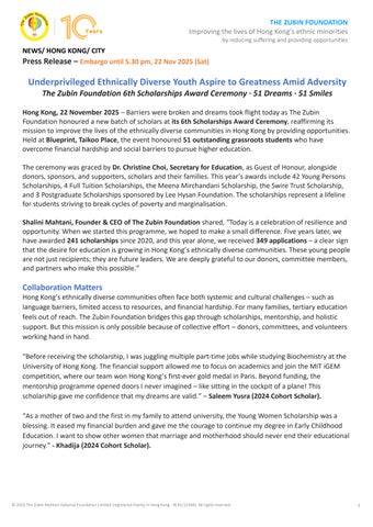 The Zubin Foundation is a registered charity in Hong Kong (IR 91/12344), named after Zubin Mahtani Gidumal. We aim at improving the lives of Hong Kong’s ethnic minorities by reducing suffering and providing opportunities. We do this by outreach in the community and driving systemic change. The Zubin Foundation relies on donations from individuals, corporations, and foundations to fund its work. For more information, please visit: www.zubinfoundation.org.