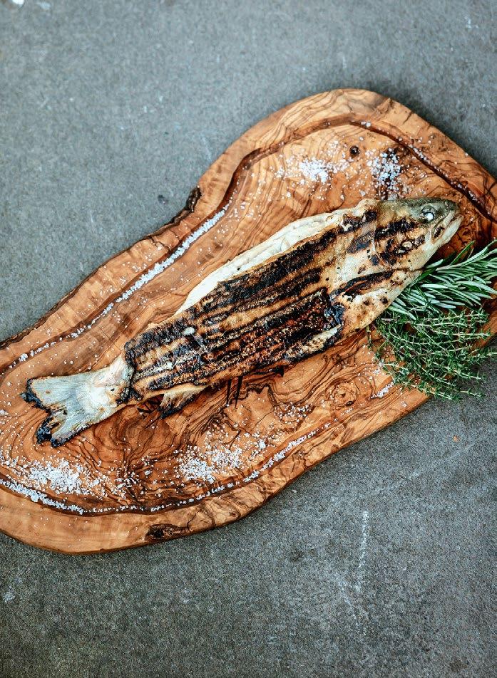 doch Dominic Bürli reagiert sofort, fängt den Rötel auf und wickelt ihn zusammen mit den übrigen Fischen in seine Kochjacke. Das improvisierte Konstrukt sieht aus wie eine riesengrosse Burrata und sorgt dafür, dass Rötel und Felchen ohne weitere Zwischenfälle in der «Wildenmann»-Küche ankommen. Dort zeigt sich das ganze handwerkliche Geschick von Jeune Restaurateur Dominic Bürli. Er setzt nach dem Schuppen das Messer am Rücken der Fische an und entfernt mit präzisen Schnitten die Gräten und Eingeweide. Was übrig bleibt, sieht aus wie ein ganzer Fisch, ist aber ein Doppelfilet mit Kopf. «So mache ich das seit rund zwei Jahren, funktioniert bestens», sagt unser Gastgeber und legt den gewaltigen Felchen auf den Holzkohlegrill in der Küche.