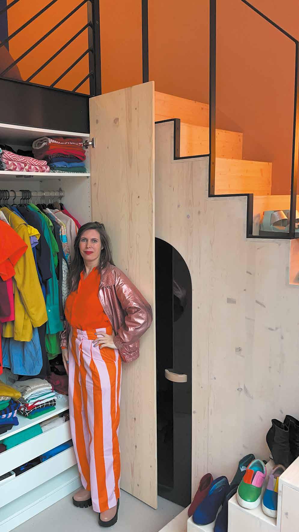Voor Maaike Muis (44) is naaien meer dan een hobby: het is een superpower. De podcastmaker en moderator in de creatieve sector woont in een lichtroze huis in Amsterdam, samen met haar man, architect en kunstenaar Chris Adriaan, en kinderen Mies (10) en Toon (8). Haar kledingkast? Voor driekwart gevuld met zelfgemaakte stukken, zoals de vrolijke roze-oranje broek op de foto, gemaakt van een Ikea-dekbedovertrek.