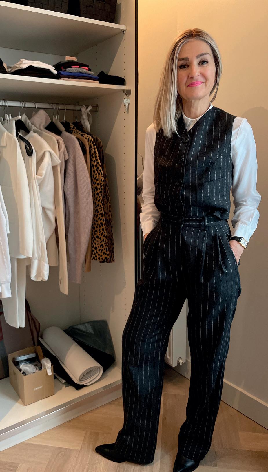 “Stijl is bijna niet in woorden te vatten. Het heeft te maken met kernwaarden en waar je voor staat. Als ik me verdrietig of onzeker voel, draag ik kleding die me kracht geeft, bijvoorbeeld een strak gesneden broek met een zwarte kasjmier coltrui en een mooie colbert erover. Daarin ga je al wat rechterop staan. Naar een zakelijke afspraak draag ik weer andere outfits, bijvoorbeeld iets met een krijtstreep, zoals op de foto. Ben ik vrolijk dan zie je me in een crispy katoenen oversized shirt, open geknoopt zodat een stukje decolleté zichtbaar is. Stoffen zijn voor mij alles. Katoen ademt. Kashmir is zacht en geeft troost.”