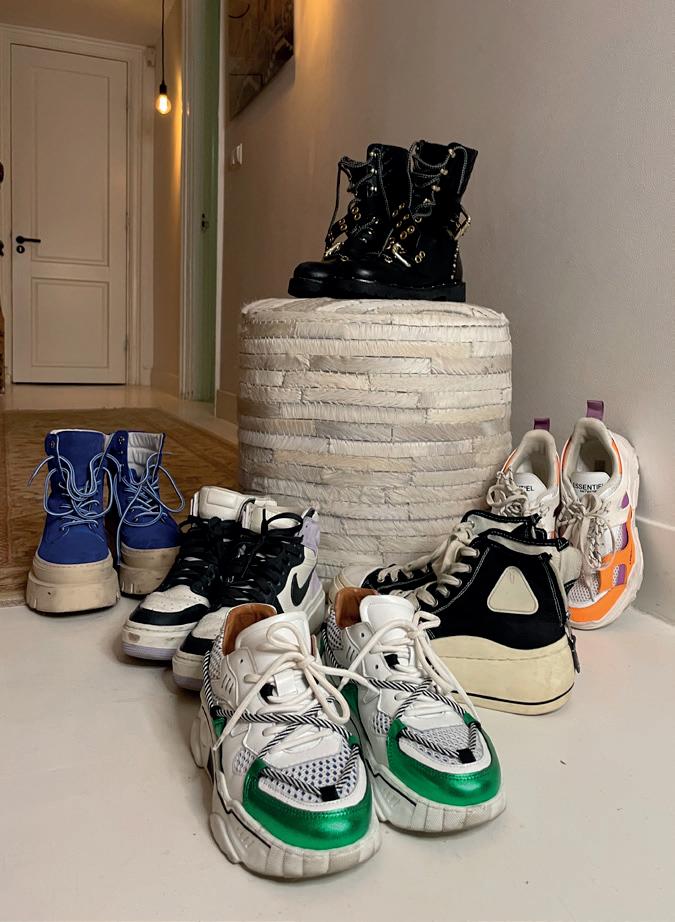 “Mijn kledingstijl is een beetje van alles wat. Ik loop graag in een oversized mannenpak, draag altijd iets op m’n hoofd en stijl dat af met rode lippenstift, een zonnebril, een heuptasje en een paar stoere gympen van bijvoorbeeld DWRS Label. Op kisten loop ik ook graag. Weet je wat ik het leukste vind? Iets uit je kast pakken en daar omheen combineren. Dat je denkt, waar heb ik zin in, hoe wil ik er vandaag uitzien? Gewoon je gevoel volgen. Shoppen in je eigen kast. Tegenwoordig kan iedereen er goed uitzien.”