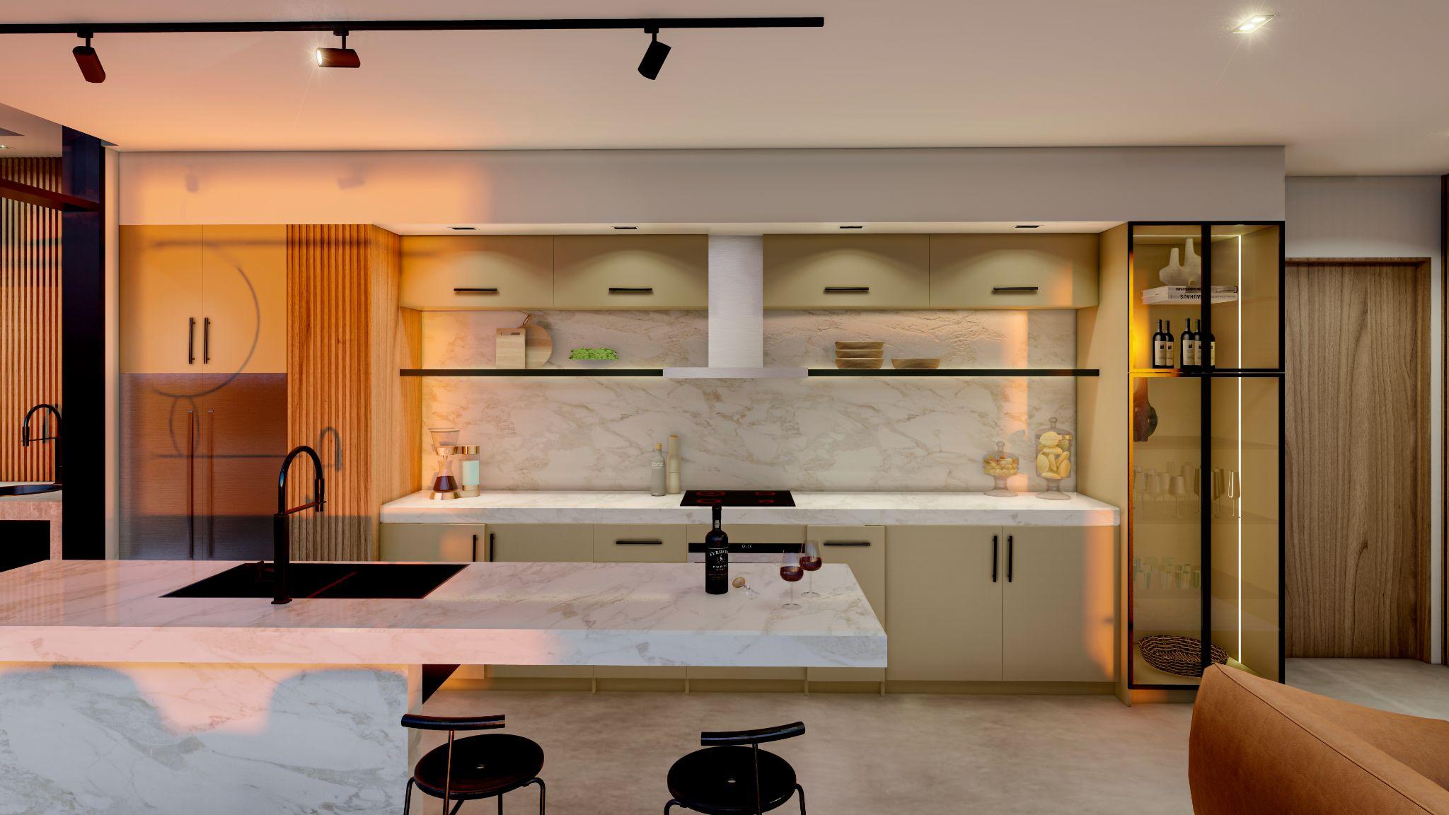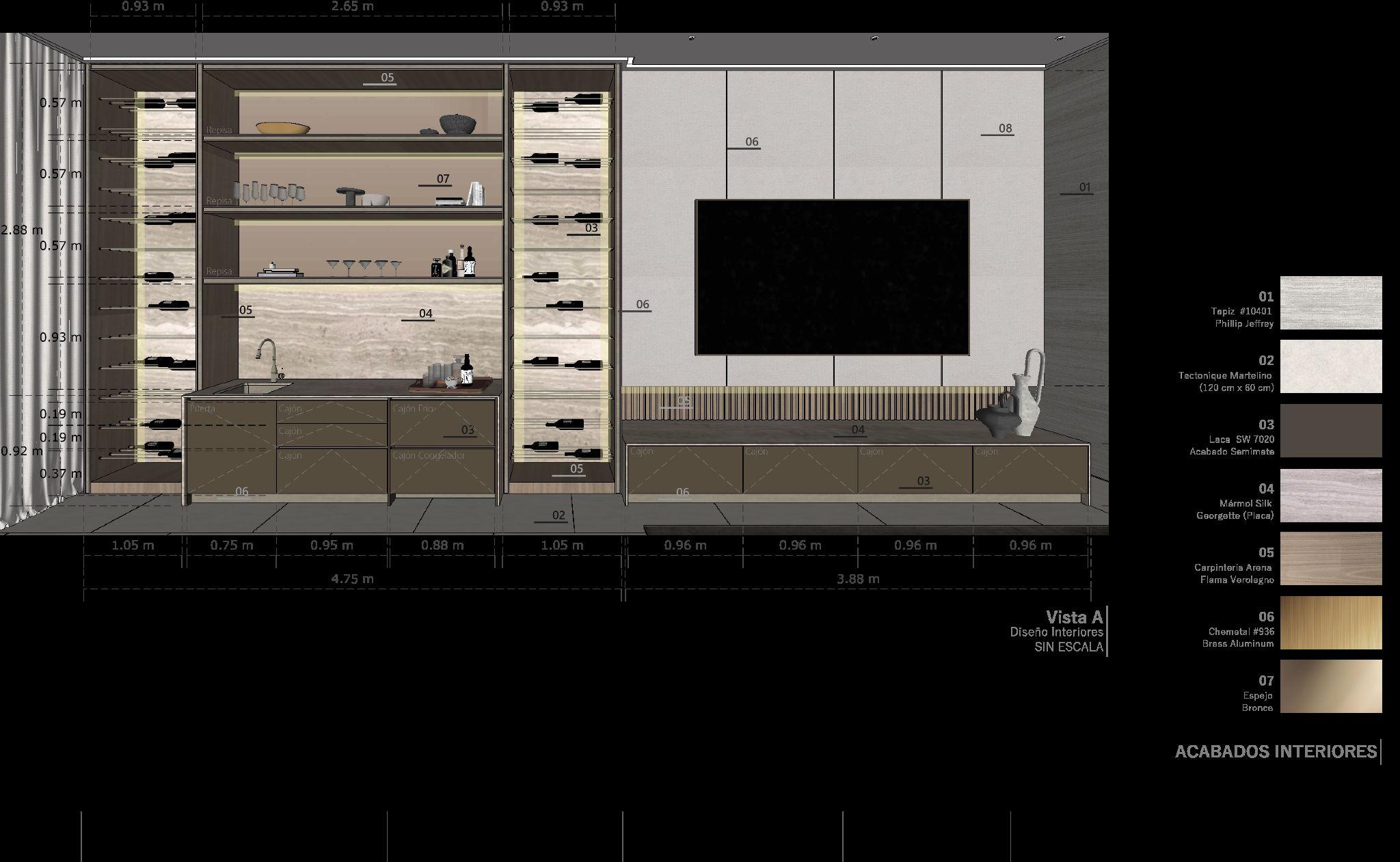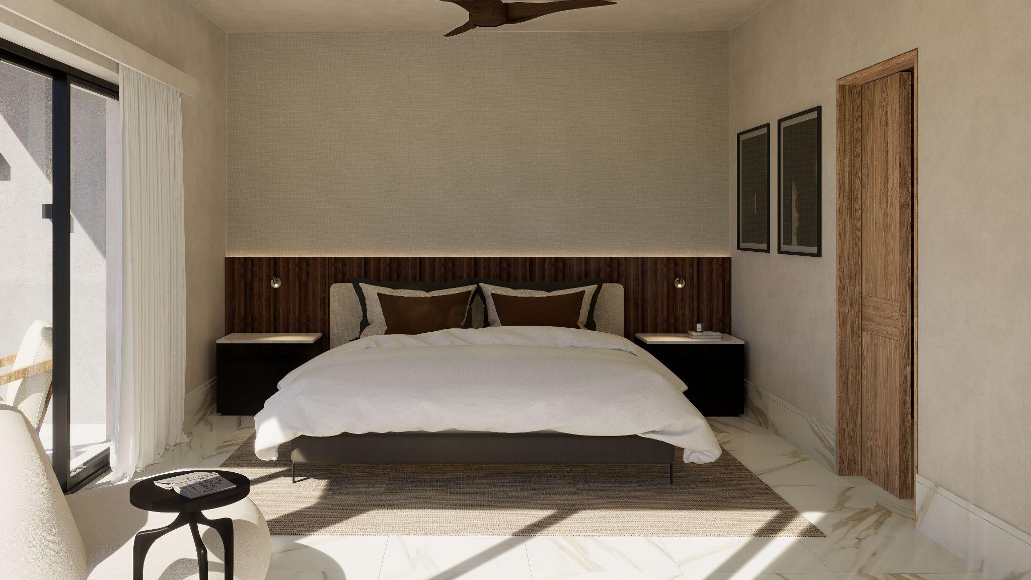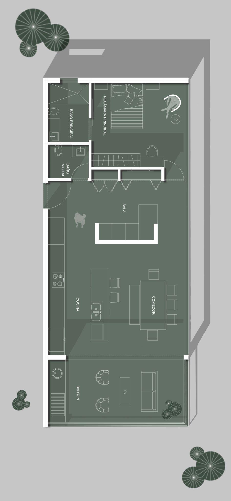 La recámara principal se enfoca en el bienestar ecológico y en transmitir una sensación de paz y confort al usuario. El área social cuenta con sala, cocina, comedor y terraza con asador; se busca aprovechar al máximo el espacio y la entrada de luz natural,creandounaconexiónconelexterior.