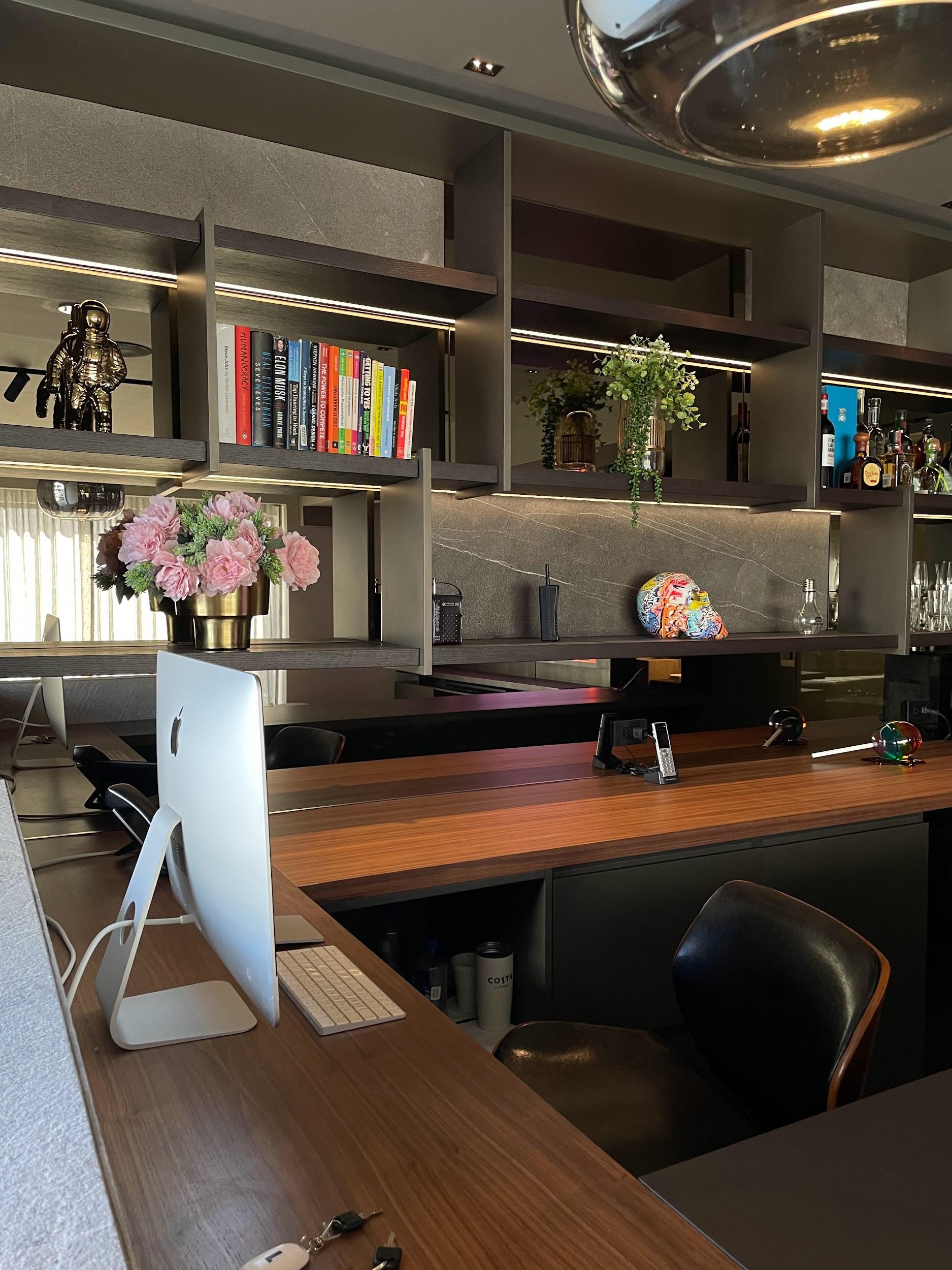 Oficina estilo sala de exposición, ubicado en San Pedro Garza García, N.L. El cliente buscaba que la oficina tuviera un estilo residencia de lujo, como áreasocialconformadaporuna recepciónestilobar ylasaladeesperaconformadaporuncómodosillón y un set de mesas de centro, simulando una sala de TV.