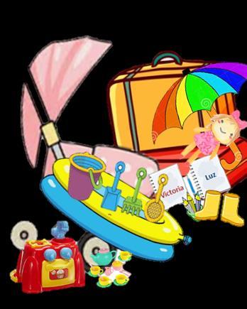 Están las botas de agua y también está el paraguas, por si se pone a llover, los lápices de colores, el bloc de colorear . . . los muñecos, la cocina, las tacitas de jugar. . . cubo, rastrillo y pala, tampoco pueden faltar. . . y, también va la piscina, si nos queremos bañar.