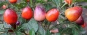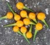 Capsicum baccatum. Zöldből narancssárga színűvé érnek a gömb alakú termések. Csípőssége: ~1.000SHU