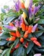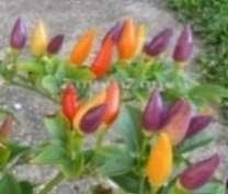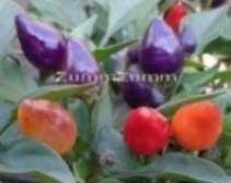 Capsicum annuum. Rendkívül látványos növény a zöldes lilás leveleivel, és a szívárvány színeiben pompázó terméseivel, melyek egyszerre megfigyelhetőek a növényen. Égnek álló, kb. 2cmnagyságú termései lila, sárga-narancs majd piros színűvé változnak. Csípőssége: 10.000-30.000SHU