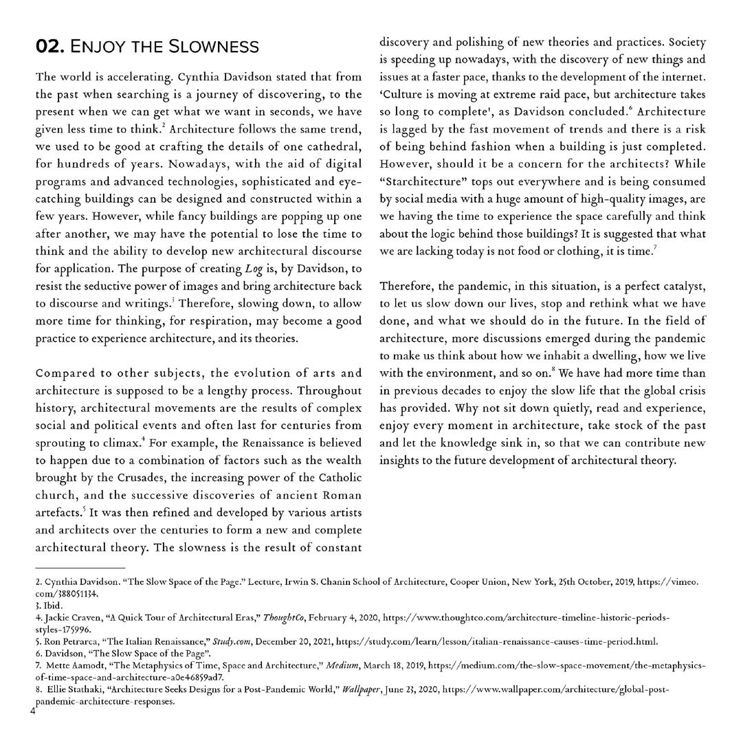 Although it follows strict academic protocols, the design report is also a designed object in itself. We aim to construct it in a way that efectively, efciently, and eloquently introduces our architectural design project, while demonstrating our comprehensive understanding of various architectural aspects. Our objectives are to critically argue our design proposal's rationale, demonstrate our ability to synthesise analytical documentation encompassing various architectural issues, and develop skills in communicating architectural design proposals eloquently. The design report serves as a bridge between our architectural education and practice, assisting both peers and those involved in project implementation to understand and appreciate our work.