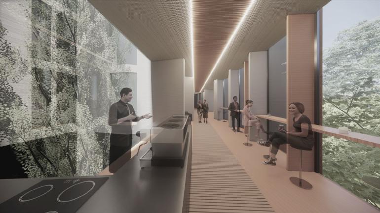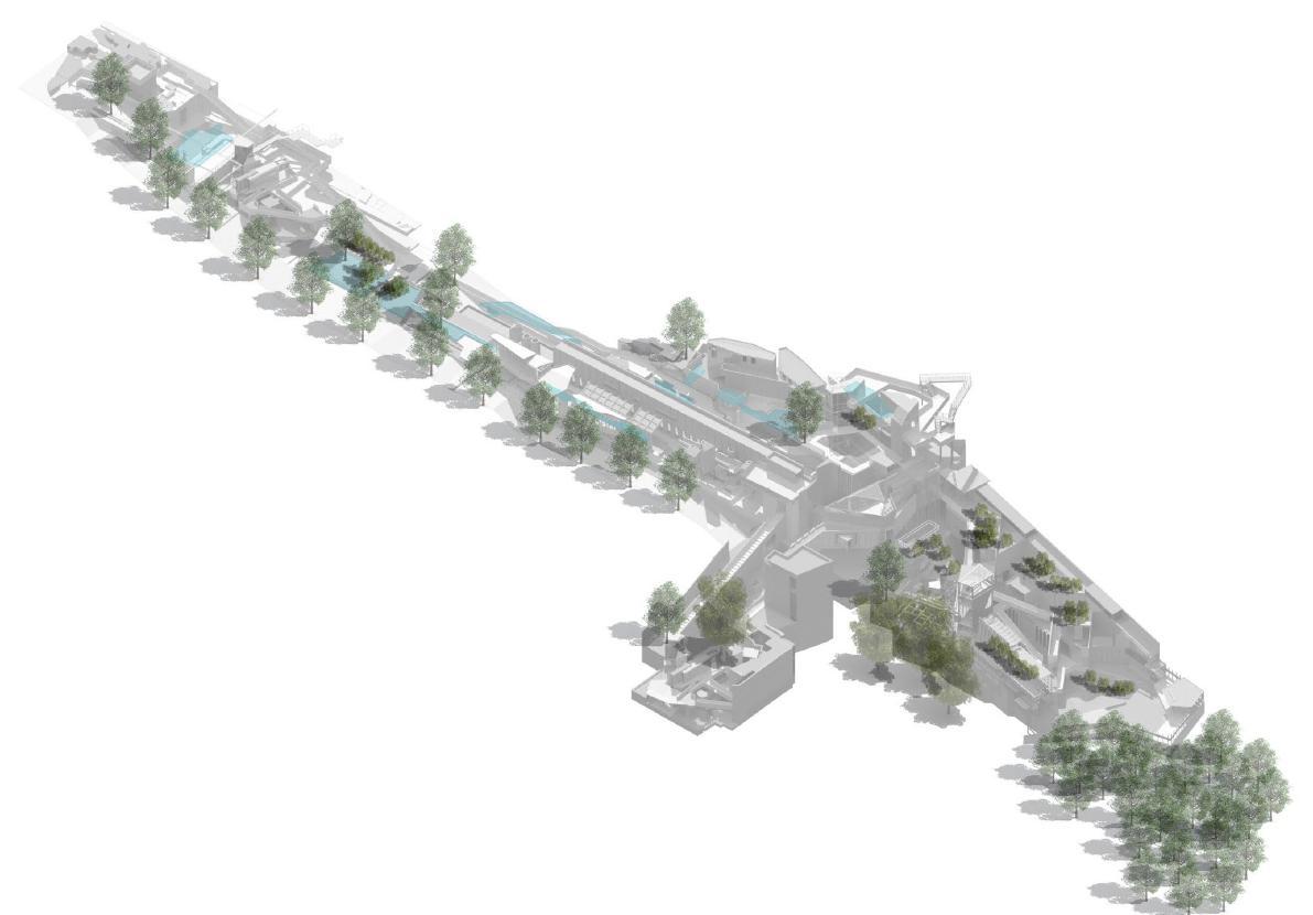 Incorporating an abundance of trees and green roof systems into the design demonstrates a commitment to environmental sustainability, enhanced aesthetics, and improved quality of life for occupants and visitors alike. The integration of trees throughout the site contributes to cleaner air, natural shading, and the creation of inviting, tranquil spaces for relaxation and social interaction. Similarly, the implementation of green roof systems not only bolsters the project's ecological footprint but also aids in efective stormwater management, improved thermal performance, and enhanced biodiversity. These thoughtful design choices foster a harmonious connection with nature, elevating the overall experience while promoting responsible and sustainable architectural practices.
