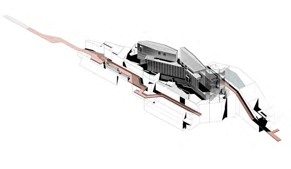 The layout of the design illustrates the seamless integration of various nodes brought together through the logic of folding the landscape. The arrangement of these nodes on the site demonstrates the harmonious interplay between the built environment and the natural surroundings, resulting in a cohesive and contextually responsive design.