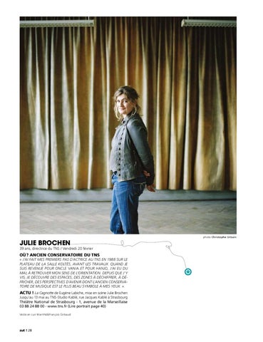 Actu ! La Cagnotte de Eugène Labiche, mise en scène Julie Brochen Jusqu’au 13 mai au TNS-Studio Kablé, rue Jacques Kablé à Strasbourg Théâtre National de Strasbourg - 1, avenue de la Marseillaise 03 88 24 88 00 - www.tns.fr (Lire portrait page 40) Veste en cuir Marithé&François Girbaud