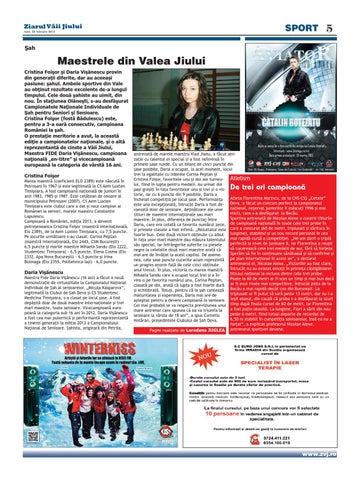 antrenată de marele maestru Vlad Jianu, a făcut senzaţie cu talentul ei special şi a fost neînvinsă în primele şase runde. Cu un bilanţ de cinci puncte din şase posibile, Daria a ocupat, la acel moment, locul trei la egalitate cu liderele Corina Peptan şi Atletism Cristina Foişor, favoritele unu şi doi ale turneului, fiind în lupta pentru medalii. Au urmat doi paşi greşiţi în faţa favoritelor unu şi trei şi o victorie, iar cu 6 puncte din 9 posibile, Daria a Atleta Florentina Marincu, de la CNS CSŞ „Cetate” încheiat competiţia pe locul şase. Performanţa este una excepţională, întrucât Daria a fost de- Deva, a făcut un concurs perfect la campionatul naţional, rezervat juniorilor II (născuţi 1996 şi mai vansată doar de senioare, deţinătoare ale unor mici), care s-a desfăşurat la Bacău. titluri de maestre internaţionale sau mari Sportiva antrenată de Nicolae Alexe a cucerit titlurile maestre. În plus, diferenţa de punctaj între Daria, care era cotată ca favorita numărul zece, de campioană naţională în toate cele trei probe în şi primele clasate a fost infimă. „Rezultatul este care a concurat (60 de metri, triplusalt şi săritura în lungime), stabilind şi un nou record personal în cea foarte bun. Cele două victorii obţinute cu albul în faţa unor mari maestre dau măsura talentului mai rapidă cursă a competiţiei. „Ne-am dorit o triplă perfectă la nivel de junioare II, iar Florentina a reuşit său special, iar înfrângerile suferite cu piesele să cucerească cele trei medalii de aur, fără să forţeze. negre la celelalte două mari maestre arată că Sperăm să fie în continuare sănătoasă şi să confirme şi mai are de învăţat la acest capitol. De asemenea, cele şase puncte cucerite acum reprezintă pe plan internaţional în acest an”, a declarat antrenorul ei, Nicolae Alexe. „Victoriile au fost clare, un progres enorm faţă de cele cinci obţinute întrucât nu au existat emoţii în privinţa câştigătoarei anul trecut. În plus, victoria cu marea maestră titlului naţional la niciuna dintre cele trei probe. Mihaela Sandu care a ocupat locul trei şi a înPoate la 60 de metri ar fi scos un timp şi mai bun dacă vins-o pe favorita numărul unu, Corina Peptan, clasată pe doi, arată că lupta a fost foarte dură ar fi avut rivale mai competitive, întrucât pista de la şi echilibrată. Totuşi, pentru că la şah contează Bacău e mai rapidă decât cea din Bucureşti. La triplusalt ar fi putut să sară peste 13 metri, dar nu i-a maturitatea şi experienţa, Daria mai are de aşteptat pentru a deveni campioană la senioare. ieşit elanul, din cauză că proba s-a desfăşurat la scurt Cel mai probabil se va respecta previziunea unui timp după finala cursei de 60 de metri, iar Florentina a fost puţin obosită. La lungime, Flori a sărit din nou mare antrenor care spunea că ea va triumfa la peste 6 metri, fiind totuşi departe de recordul de senioare la vârsta de 18 ani”, a spus Corneliu 6,50 m stabilit în competiţia senioarelor, însă ea nu a Hotăran, preşedintele Clubului de Şah Deva. forţat”, a explicat profesorul Nicolae Alexe, Pagini realizate de Loredana JUGLEA antrenorul sportivei devene.