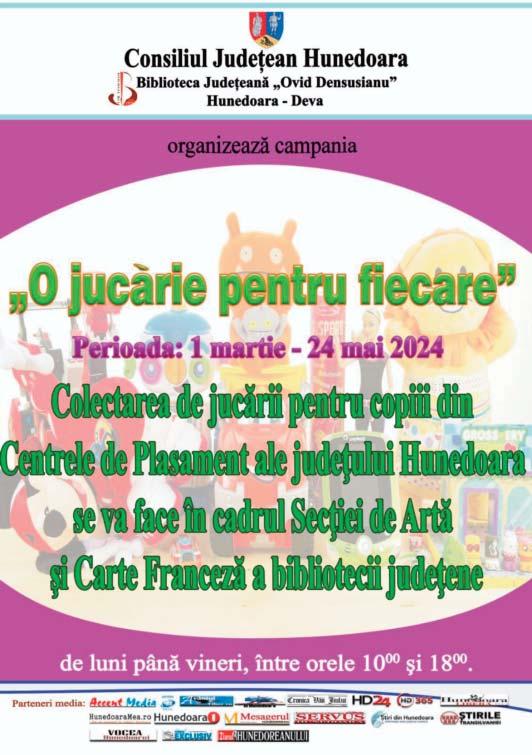 Toţi cei care vor să le dăruiască jucării copiilor din centrele de plasament din judeţ, sunt așteptaţi, începând cu data de 1 martie, la Biblioteca Judeţeană „Ovid Densusianu” Hunedoara din Deva, unde se va afla un centru de colectare a jucăriilor. Acesta va fi deschis până în 24 mai 2024, de luni până vineri între orele 10:00 și 18:00.