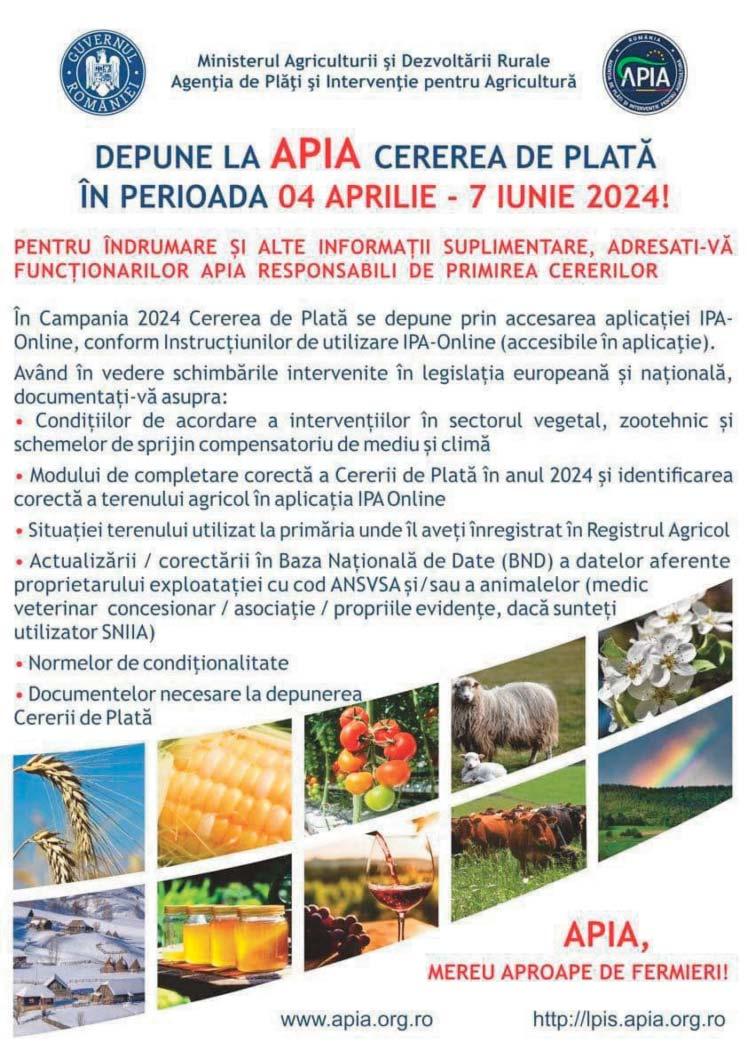 Și în acest an, fermierii pot beneficia de sprijin financiar din Fondul European de Garantare Agricolă și Fondul European Agricol pentru Dezvoltare Rurală dacă respectă anumite norme, startul campaniei de primire a cererilor de plată la Centrele APIA fiind astăzi. Sprijinul vine pentru fermieri din sectoarele zootehnic și vegetal, iar în judeţul Hunedoara sunt așteptaţi să depună cererile peste 17.500 fermieri. „S-a dat drumul cererilor de plată pentru 2024, fermierii sunt așteptaţi să vină să depună cererea unică atât pe sectorul vegetal cât și pe cel zootehnic. Ce trebuie să știe fermierii că trebuie să ajungă la APIA să divitizeze împreună cu funcţionarul cererea de plată, să ne aducă adeverinţa de la medicul veterinar dacă este cazul și solicită subvenţii sau scheme și intervenţii pe