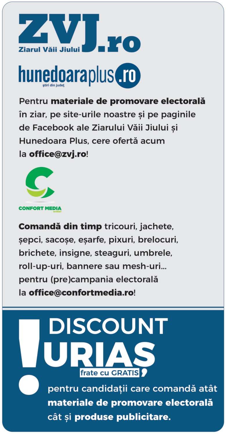 2 ACTUALITATE Editorial: zvjro2008@yahoo.ro Colectivul de redacţie: Corneliu BRAN Loredana JUGLEA - 0723.446831 loredanajuglea@yahoo.com Gheorghe OLTEANU - 0724.930338 Mihaela PETROŞAN Redacţia şi administraţia: 332006 Petroşani, str. Tineretului, cămin 1, etaj 1, camera 337, jud. Hunedoara; 0254.549020 (Telekom fix/fax); 0735.727264 (Vodafone mobil); Management: office@zvj.ro Editorial: zvjro2008@yahoo.ro Publicitate: zvj2008@yahoo.com Colaboratori permanenţi: Mircea ANDRAŞ , Irina BOBOC, Gilbert DANCO, Ion HIRGHIDUŞ, Sonia LIBERESCU, Alin RUS DTP: Confort Media Publicitate: Mirabela FLEŢAN - 0735.727264 Administrativ / Difuzare: Marcel DOCEA - 0761.756839 COTIDIAN REGIONAL CU CAPITAL INTEGRAL PRIVAT. FONDAT 2008. ISSN 2065 - 5096 - Biblioteca Naţională a României Editor: SC Aldo Detail Direct SRLPetroşani RO 32719137 n J20/82/2014 Director:Cătălin DOCEA docea@zvj.ro facebook.com/ziarulvaiijiului vineri, 5 aprilie 2024 Uricani