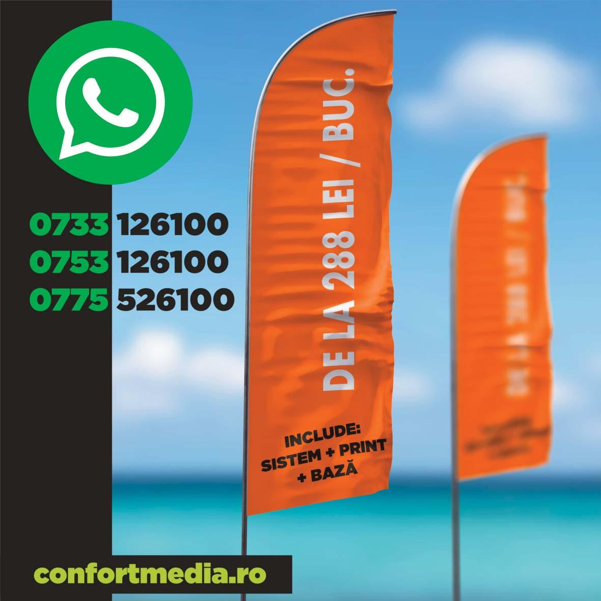 Preţul final pentru un steag complet echipat (sistem, print de calitate și bază de fixare la sol) pleacă de la 288 de lei.