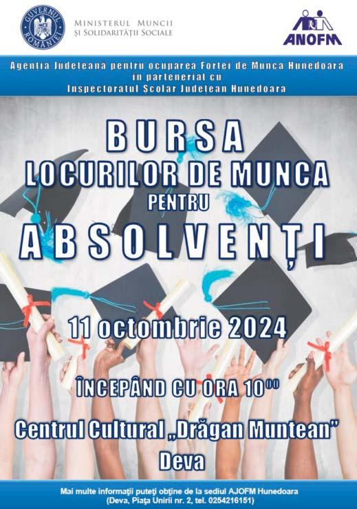 Peste aproape o lună, în 11 octombrie, absolvenții sunt invitați la o bursă a locurilor de muncă, dedicată lor. Evenimentul va avea loc la Deva. Până atunci, angajatorii care au nevoie de forță de muncă, se pot înscrie pentru a putea participa la AJOFM .