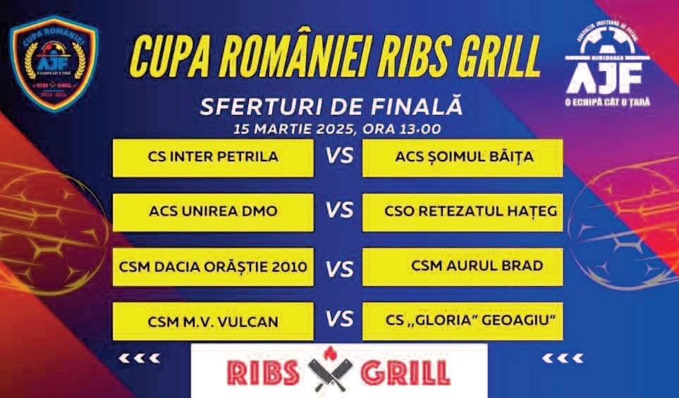 CSM Mihai Viteazu Vulcan - CS Gloria Orașului Geoagiu Semifinalele vor fi stabilite printr-o nouă tragere la sorți Se anunță meciuri intense și spectacol pe teren. Cine va merge mai departe? Așteptăm cu nerăbdare confruntările din sferturi!