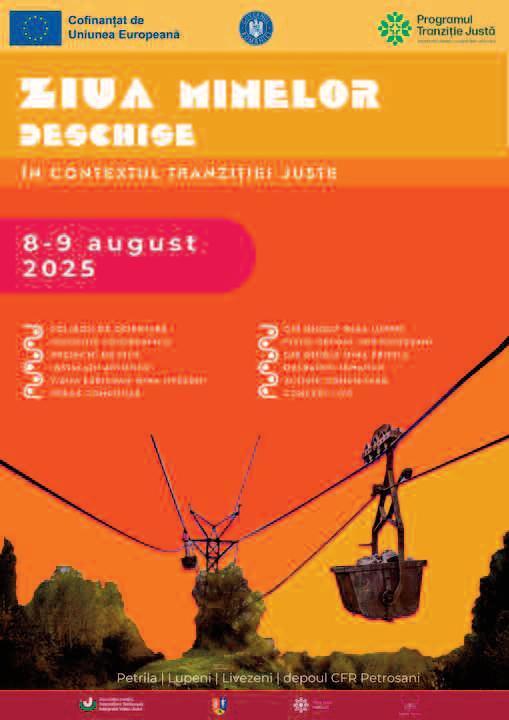 Acest eveniment unic aduce la lumină patrimoniul minier al regiunii și propune o nouă viziune pentru comunitățile local fiind cofinanțat de Uniunea Europeană prin Programul Tranziție Justă și organizat de ADTI Valea Jiului în parteneriat cu Complexul Energetic Valea Jiului, Consiliul Județean Hunedoara, Valea Jiului Implicată, Urban Lab, Planeta Petrila, Car CFR, Asociația Floarea Reginei, Kinedok, EUNIC, Institutul Polonez București. Intră să afli mai multe pe pagina evenimentului: https://www facebook com/events/s/ziua-minelordeschise/1274692470984227/?mibextid=wwXIfr&rdid=7kEbs38AMl40mJU2&share url=https%3A%2F%2Fwww facebook com%2Fshare%2F16HkWYyyud%2F%3Fmibextid %3DwwXIfr#