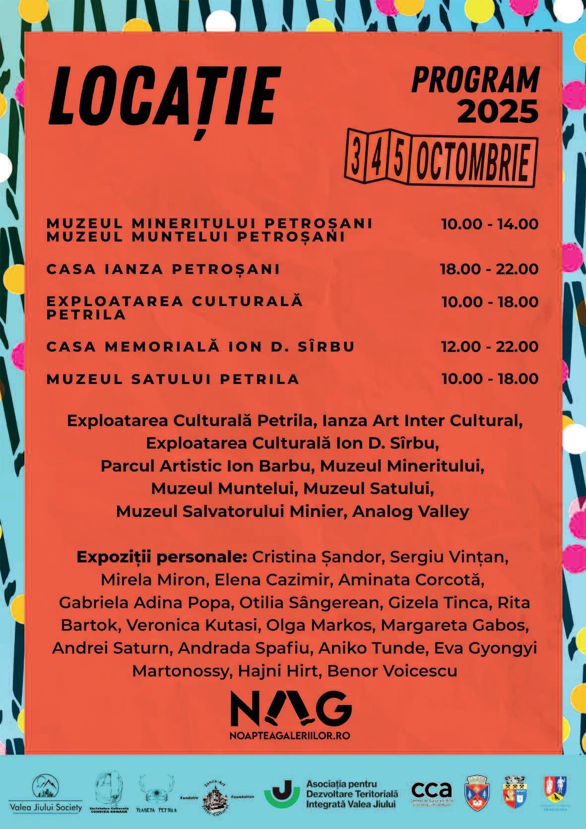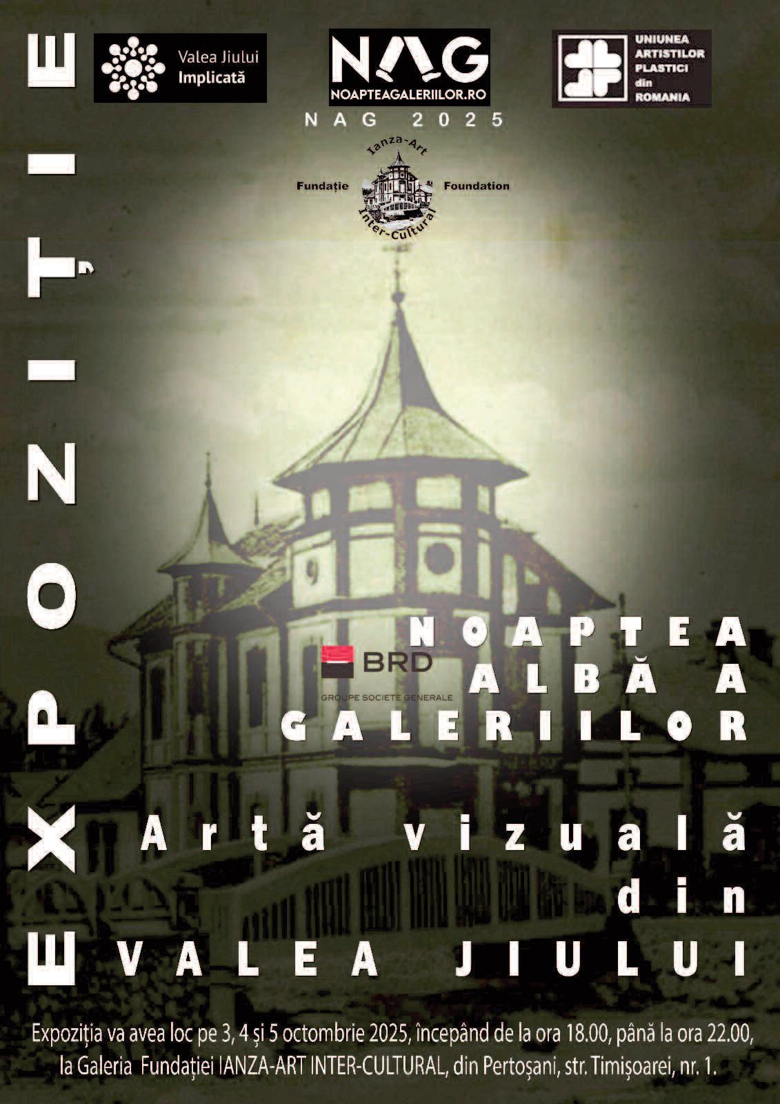 În primul weekend din octombrie, Valea Jiului devine scenă deschisă pentru arta contemporană, patrimoniul local și spațiile culturale neconvenționale. Noaptea Albă a Galeriilor – NAG 2025 aduce în Petroșani și Petrila un traseu artistic vibrant, cu expoziții, instalații, vernisaje și intervenții creative în locuri cu memorie și potențial La nivel național, între 3 și 5 octombrie, se reactivează, pentru al 19-lea an consecutiv, harta descoperirilor creative în spațiile dedicate artei contemporane din București și alte 16 orașe din țară. NAG 2025 pune pe hartă peste 200 de proiecte în galerii, spații alternative, hub-uri creative și ateliere de creație din București, Alba Iulia, Arad, Brașov, Cluj-Napoca, Craiova, Galați, Hunedoara, Iași, Mediaș, Râmnicu Vâlcea, Reșița, Sfântu Gheorghe, Sibiu, Târgu Mureș, Timișoara și Valea Jiului (Petrila și Petroșani).