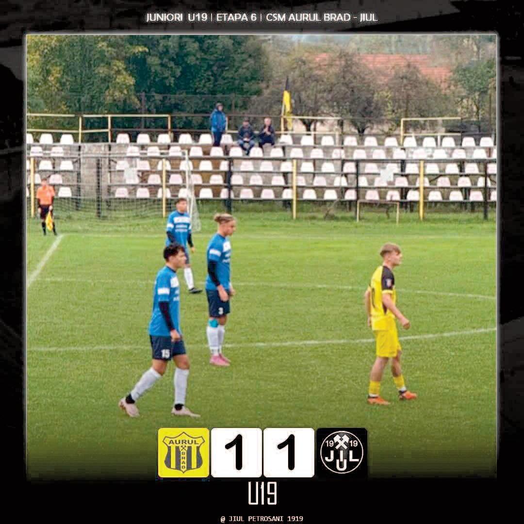 Echipa Under 19 Jiul Petroșani s-a întors cu un punct din deplasarea de la Brad, scor 1-1. „Un rezultat muncit și meritat pentru băieții noștri! Felicitări întregii echipe pentru atitudine, dăruire și pentru că au luptat până la final! Bravo, Jiul! Hai băieții!”, a fost mesajul clubului jiulist. Un alt meci la Under 19 s-a încheiat cu un scor spectaculos.