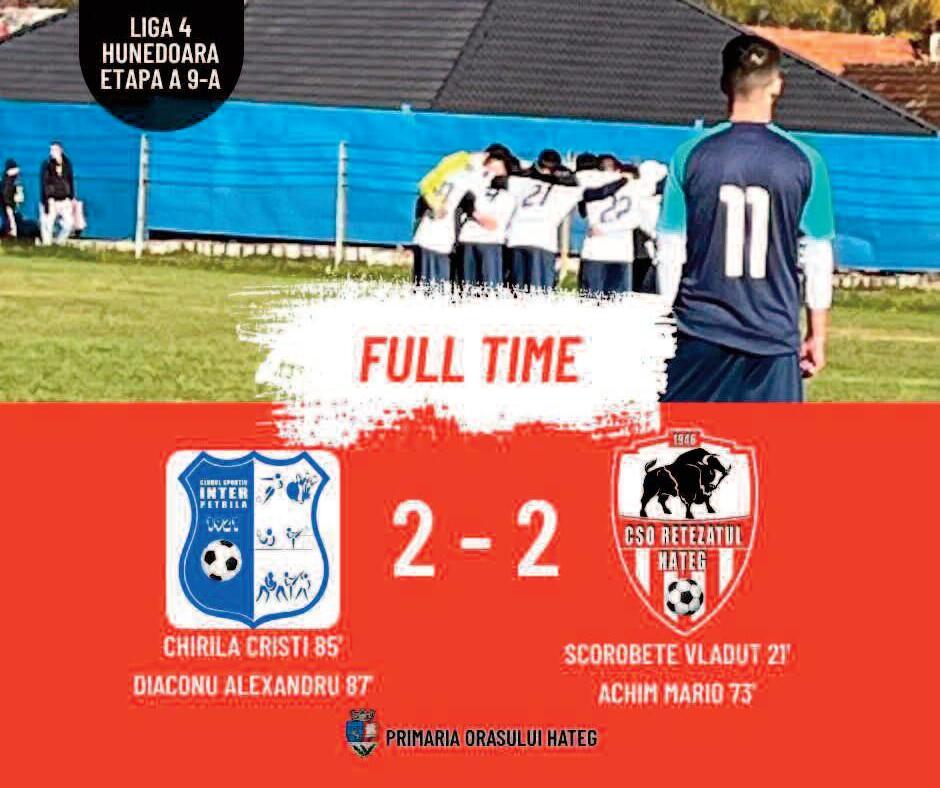 A plouat cu goluri în etapa a noua din campionatul județean, la fotbal, unde s-au marcat 34 de goluri În trei partide s-au impus gazdele, o partidă a fost a oaspeților și un joc s-a încheiat la egalitate. Retezatul Hațeg a condus în deplasare pe Inter Petrila cu 2–0, dar două reușite ale petrilenilor în ultimele cinci minute i-au privat pe hațegani de două puncte. „Un meci cu multe emoții la Petrila! Băieții noștri au condus cu 2-0, însă gazdele au reușit să egaleze pe final, în doar câteva minute Chiar dacă victoria ne-a scăpat printre degete, echipa noastră a arătat determinare, organizare și dorință de luptă până la ultimul fluier. Felicitări băieților pentru atitudinea din teren și mulțumiri suporterilor care ne-au fost alături și în această deplasare! Urmează o nouă etapă, iar Retezatul Hațeg merge înainte cu aceeași ambiție și dorință de a aduce noi puncte acasă!”, au spus hațeganii