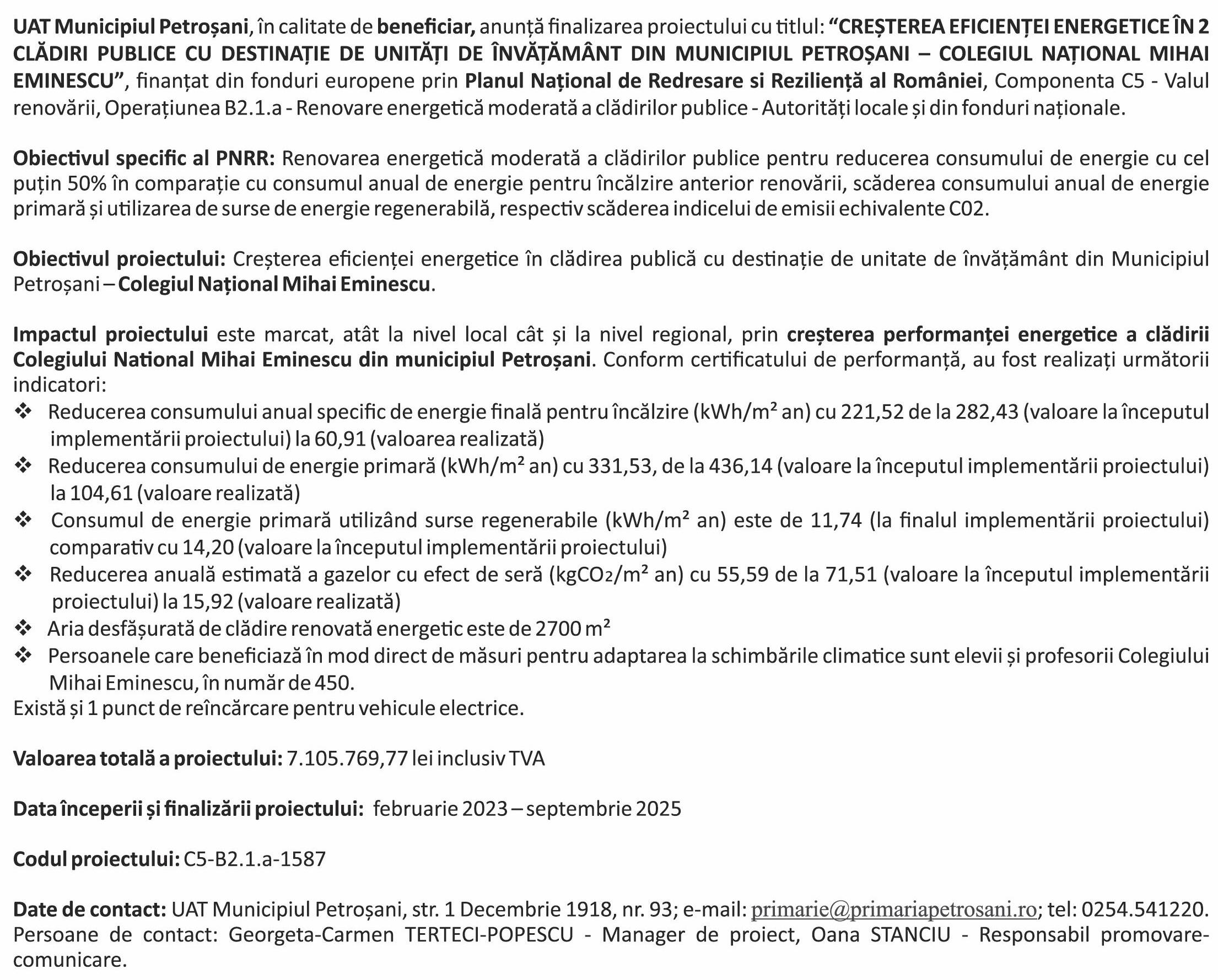 în CF nr 64417 Petrila și se va achita la caseria autorității contractante