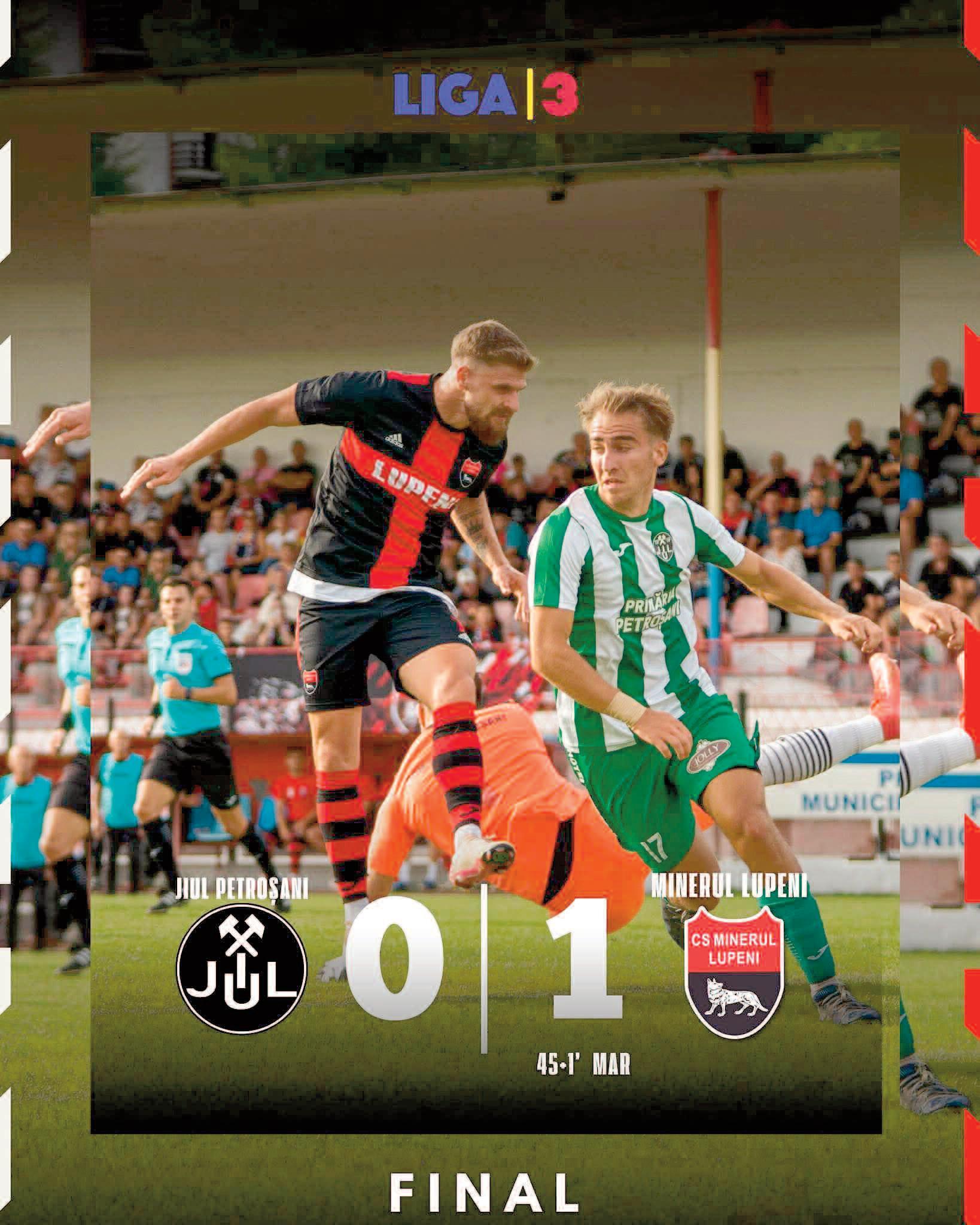 Derbiul dintre Minerul Lupeni și Jiul Petroșani a avut, ca de fiecare dată, tot ce înseamnă fotbal adevărat: tensiune, atmosferă, emoții și două galerii care au trăit fiecare secundă Dar de data aceasta, povestea s-a scris cu roșu și negru!