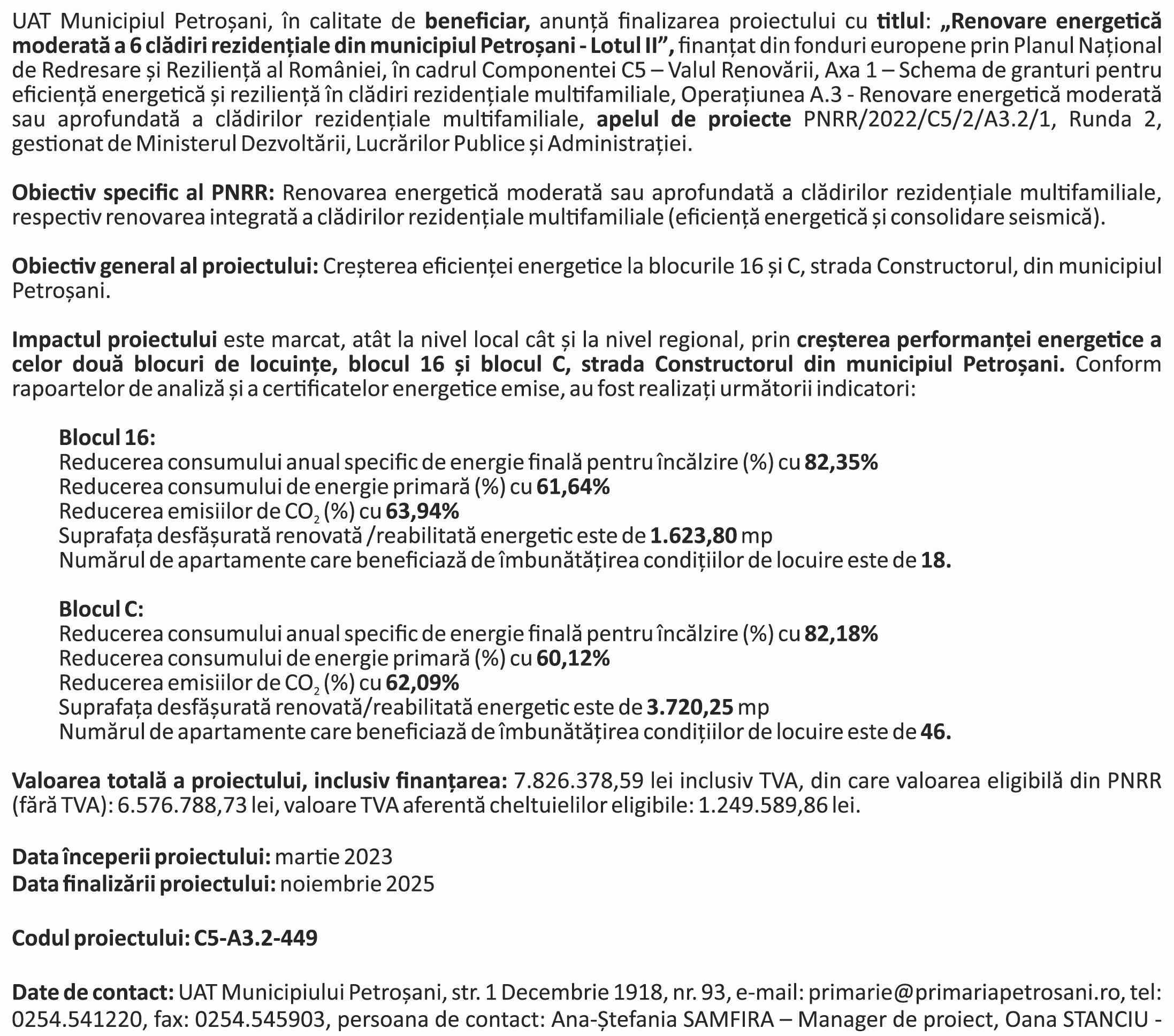 lansarea de noi competiții și vrem să ne încadrăm și lucrăm la înscrierea unor proiecte cu cofinanțare zero. Ca și cel dinainte, e tot cu cofinanțare zero, în așa fel încât să reducem consumurile, sau plata consumului, pentru că consumurile nu le putem reduce, de energie și reducerea consumurilor la încălzire Și, bineînțeles, vrem să cuprindem și cantina, rămânând doar două spații, corpurile vechi, cel administrativ și cu corpul B, în care mai desfășăm activități care, pentru moment, nu avem soluții să reducem încă consumul de energie, tot prin asemenea panouri fotovoltaice