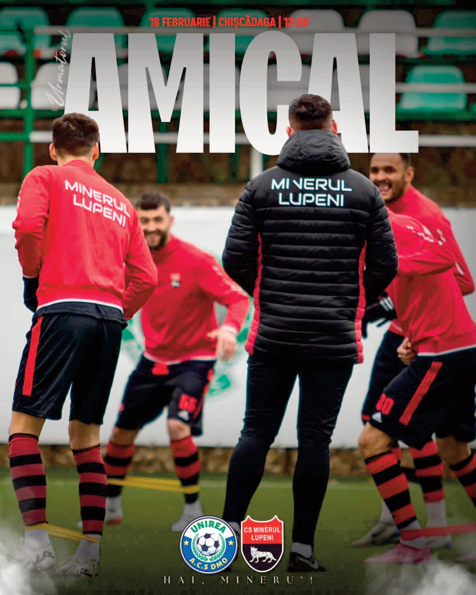 Amicalul programat pentru data de 18 februarie, ora 12:00, împotriva celor de la Unirea DMO, nu se mai dispută la locația stabilită anterior. Noua arenă de luptă este baza sportivă din Chișcădaga. Băieții de la Lupeni sunt în plină perioadă de pregătire de iarnă, iar un astfel de meci, pe o