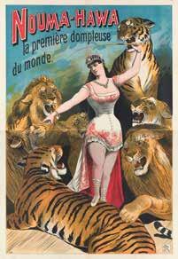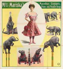 In this same vein are the posters of tamers who worked with their animals based on trust and knowledge. Claire Heliot, for instance, was a famous German female lion tamer who was renowned for carrying a 159 kg Sicchi lion on her back. Another example is Ep Thompson, who was one of the first black animal trainers specialized in training elephants; Thompson was the first animal tamer to break through the allwhite barrier of the circus business. The circus world’s traditionally white perspective is also present in the ‘blackface’ or ‘minstrel’ posters that were printed between 1874 and 1882, depicting white actors who are painted black to ridicule Afro-American slaves for the entertainment of white people. Obviously, this type of representation is nowadays rejected for its racist character and equally so is the notion of an all-white circus world.