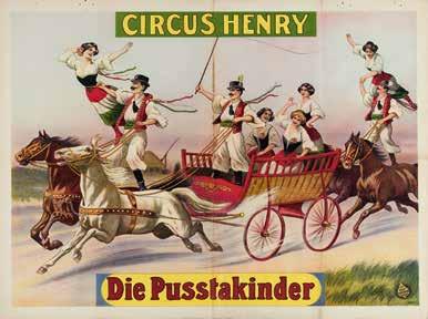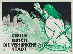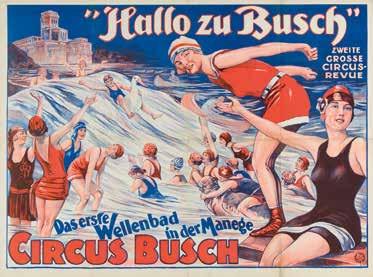 3412 [Somersaults] Circus Gebr. Blumenfeld jr. Magdeburg- Friedländer, Hamburg, 1924. 71 x 47.5 cm. Lith. no. 7542. Mild wear in fold. lines. *Circus Blumenfeld was founded in 1811 by Moritz Hirsch Levy. During the 19th century the circus became one of the largest of its time, and was passed on from father to son(s). In 1874 the circus obtained a residence in Guhrau. These new winter quarters were often shared with the Jewish Strassburger circus, a circus linked by marriage for several generations. In 1920 the circus set up their permanent base in Magedburg. However, like many other Jewish enterprises, Blumenfeld fell victim to the eco nomical crisis and rise of national socialism; they went bankrupt at the end of the 1920s and only one family member was to survive the Holocaust. € 80 - € 150 3411