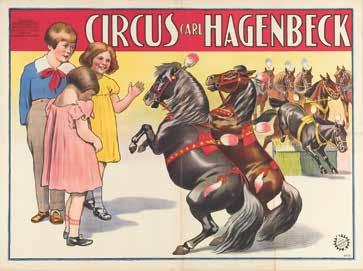 3441 [Announcement. Blumenfeld] Das Gastspiel des Circus Carl Hagenbeck hat begonnen!- Friedländer, Hamburg, 1929. 119 x 84 cm. Lith. no. 8543. With the owner’s stamp of Edwin Schirmer in lower right. Some toning, mild wear. *Circus Blumenfeld was founded in 1811 by Moritz Hirsch Levy. During the 19th century the circus became one of the largest of its time, and was passed on from father to son(s). In 1874 the circus obtained a residence in Guhrau. These new winter quarters were often shared with the Jewish Strassburger circus, a circus linked by marriage for several generations. In 1920 the circus set up their permanent base in Magedburg. However, like many other Jewish enterprises, Blumenfeld fell victim to the economical crisis and rise of national socialism; they went bankrupt at the end of the 1920s and only one family member was to survive the Holocaust. € 100 - € 200