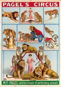 One of the most prevalent circus poster themes is the representation of animal performers. In this selection, one finds a variety of animalselephants and lions are well represented - dressed up as humans, portraying human activities (e.g. Betty’s Bears, bears walking a stroller), animals driving or seated in almost any type of transport, and animals performing acrobatic tricks such as the pyramid arrangement and balancing on a ball or seesaw. Quite a few of these performances have become a sign of the times and are considered controversial by con temporary standards regarding animal welfare.