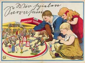 3455 [Children. Toys. Sarrasani] Wir spielen Sarrasani- Friedländer, Hamburg, 1913. 96 x 71 cm. Lith. no. 5830. Edges sl. worn and reinf. on verso. *Circus Sar rasani (Dresden) was known for its use of modern technology making spectac ular acts with e.g. cars, airplanes, boats and projections. After WWI broke out, Hans Stosch-Sarrasani turned the circus into a live-action military war theatre, showing important war scenes of WWI, such as the invasion of Belgium by the Germans in 1914, submarine warfare in the First Battle of the Masurian Lakes for which the entire ring was flooded, and would, a few years later, even show the bombing of London with zeppelins. From 1912 and onwards they started a “Wild West” show with the use of the Sioux Native Americans from the Pine Ridge Agency in South Dakota, and would perform with them at least through 1936. The circus and their permanent building did not survive the bombing of Dresden in 1944. After the war they reestablished in Argentina, where they would become the Circo Nacional Argentino.