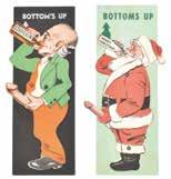 1702 [Movables] A Gift from Santa to You - Ca. 1935. Two rare cards w. pull tab, ‘Bottom’s up’. (1) ‘Merry Christmas’. Father Christmas holds a bottle, emptying the bottle releases the rod. (2) Old man drinking Stifferin, w. identical effect. Both cards and mechanisms in good condition, each 16 x 6 cm. Set incl. the orig. wr. (top side damaged). €