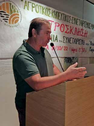 καθόλα έτοιμοι σύμφωνα με τον Νόμο. Ξεκι νάμε λοιπόν, τις εργασίες, με τακτικές συνελεύσεις, όπου θα παρουσιάζονται χρήσιμες πληροφορίες επ ωφελεία του Αγρότη, ενώ σχεδιάζεται και η εύ ρεση έδρας, αλλά και η τέλεση επίσημων εγκαινίων. Βλέπετε θετική ανταπόκριση από τον αγροτικό κόσμο της περιοχής; Δέκα είμασταν τα ιδρυτικά μέλη, οι οποίοι απο φασίσαμε να δημιουργήσουμε τον Συνεταιρισμό. Δυστυχώς, για δικούς τους λόγους και προβλη ματισμούς, δύο από τα αρχικά μέλη αποχώρησαν (σ.σ. αντικαταστάθηκαν άμεσα) και ως εκ τούτου είμασταν υποχρεωμένοι να κάνουμε δεκτές κι επι σήμως, τις εν λόγω αποχωρήσεις στο πρώτο Διοι κητικό Συμβούλιο. Το θετικό είναι πως έχουμε ήδη πενήντα περίπου συναδέλφους, οι οποίοι έχουν εκφράσει την επιθυμία να γραφτούν μέλη, αν και διαπιστώνουμε μία γενικότερη διστακτικότητα και ανασφάλεια, κάτι που όπως πιστεύουμε οφείλεται στην άγνοια και τον φόβο του καινούργιου. Αισιο δοξούμε ότι το κλίμα θ’ αλλάξει και η προσπάθειά μας, θα
