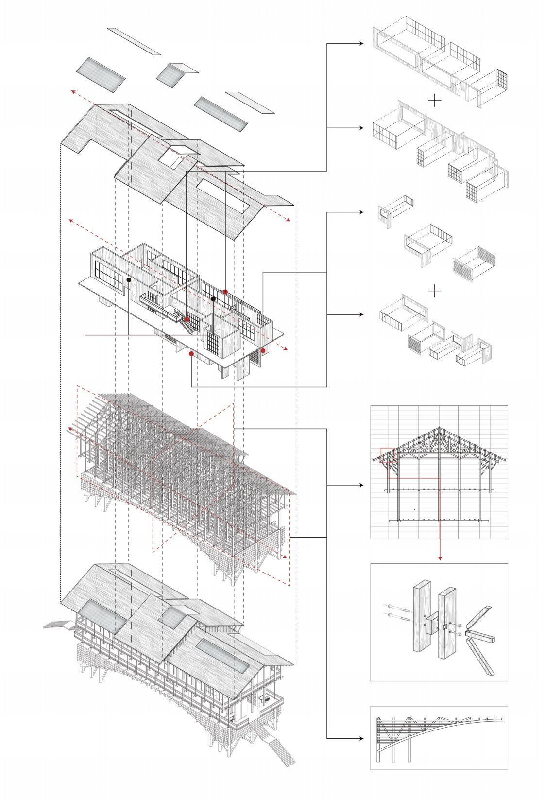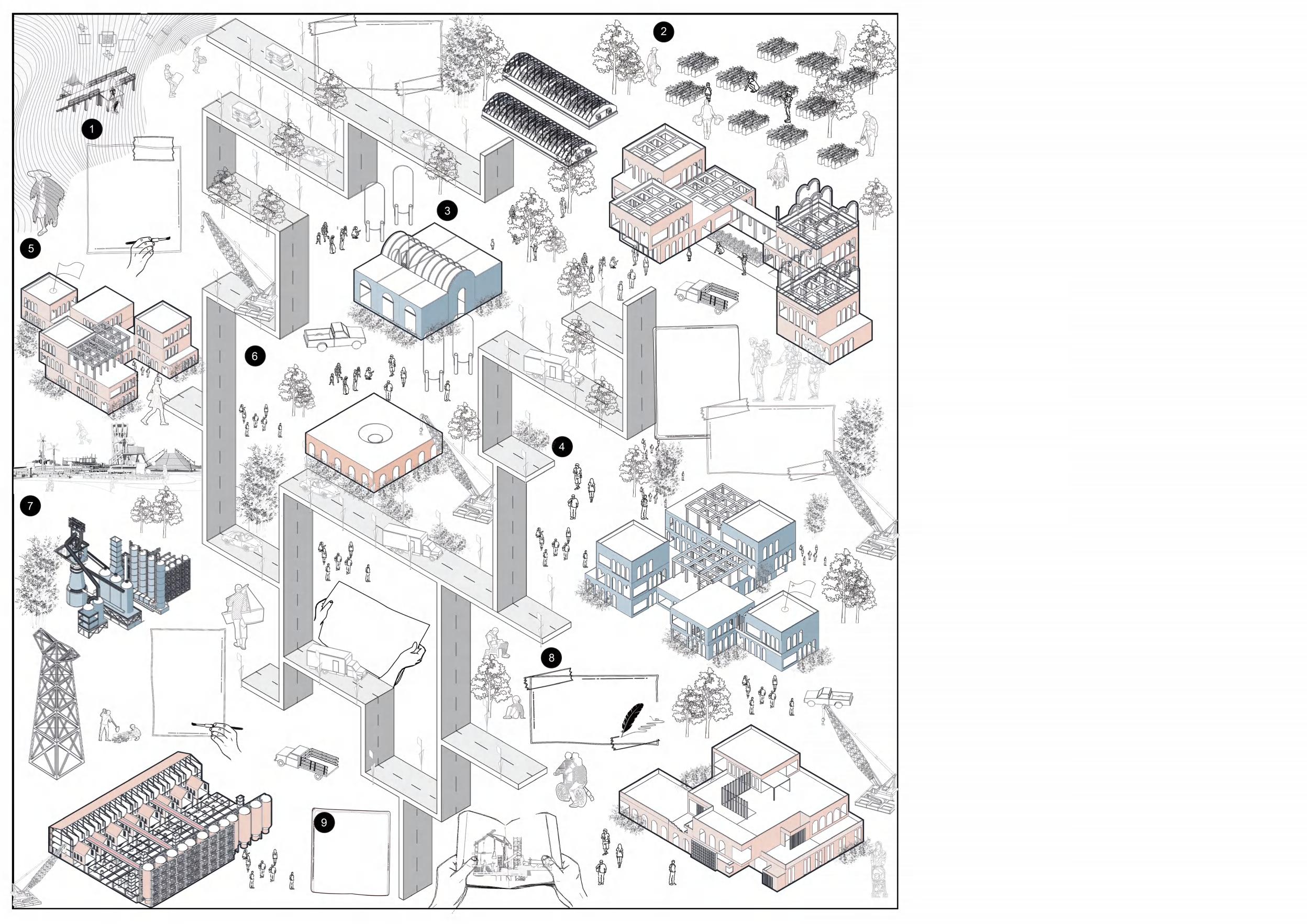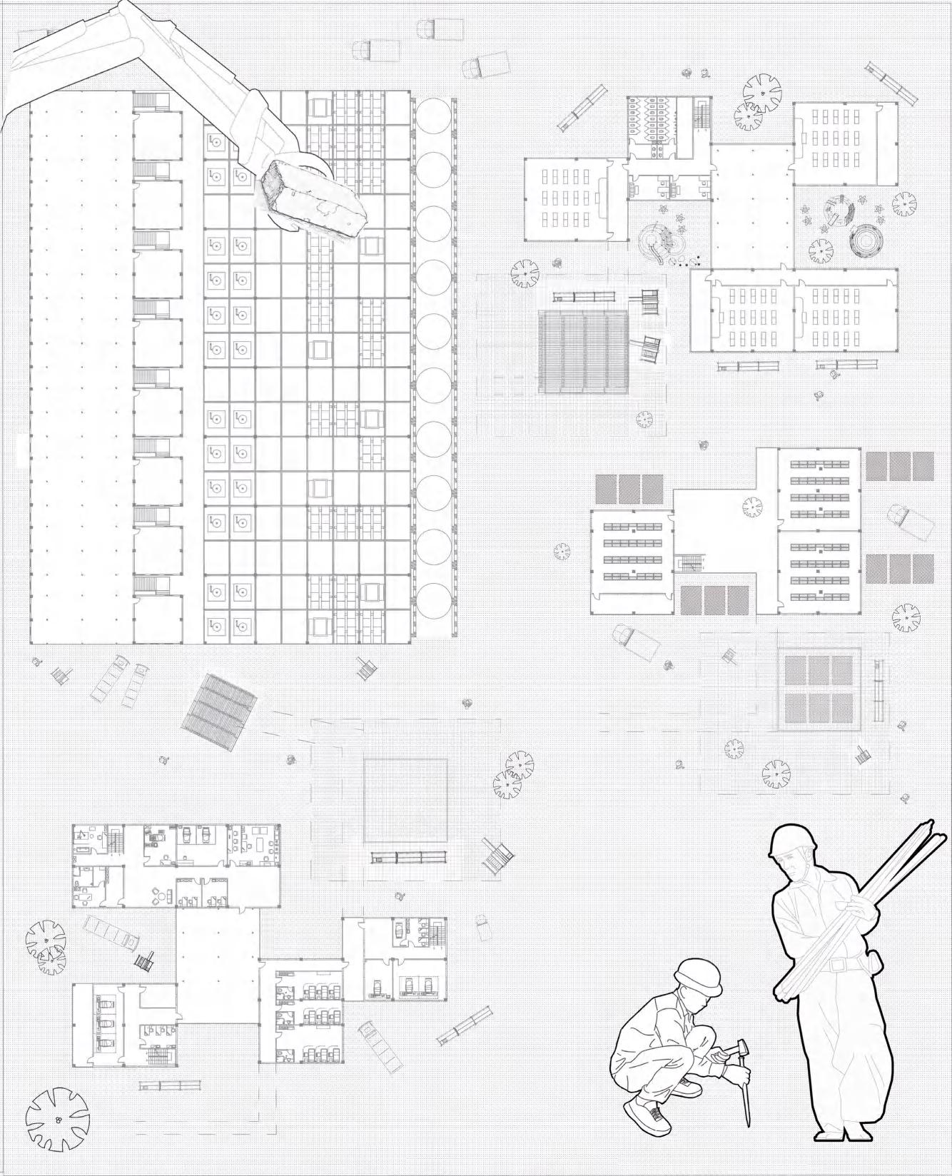 while blurring public-private boundaries. Connected by a main route and branch roads, the site links main buildings to smaller ones, achieving a harmonious blend. Using waste and locally sourced materials, modular units are created for rapid construction and camp building.