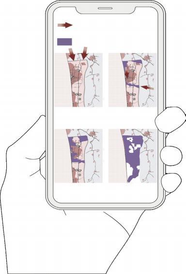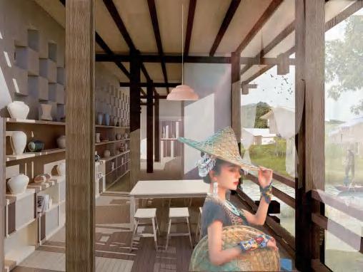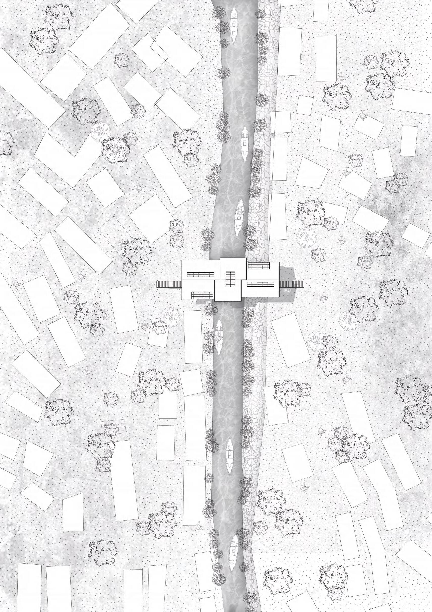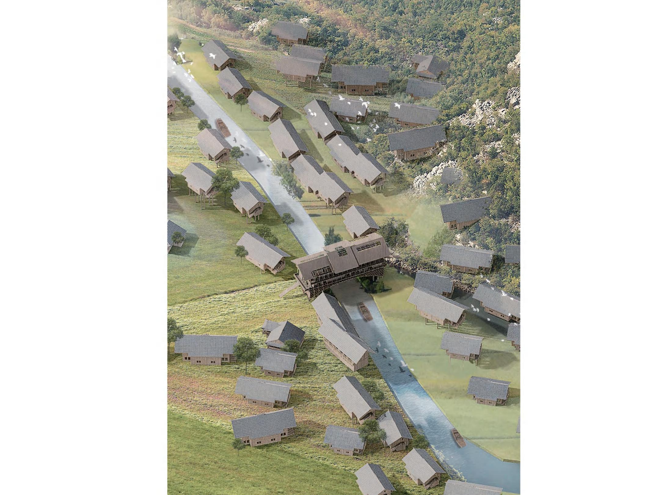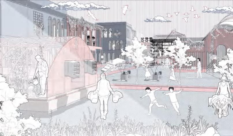 while blurring public-private boundaries. Connected by a main route and branch roads, the site links main buildings to smaller ones, achieving a harmonious blend. Using waste and locally sourced materials, modular units are created for rapid construction and camp building.