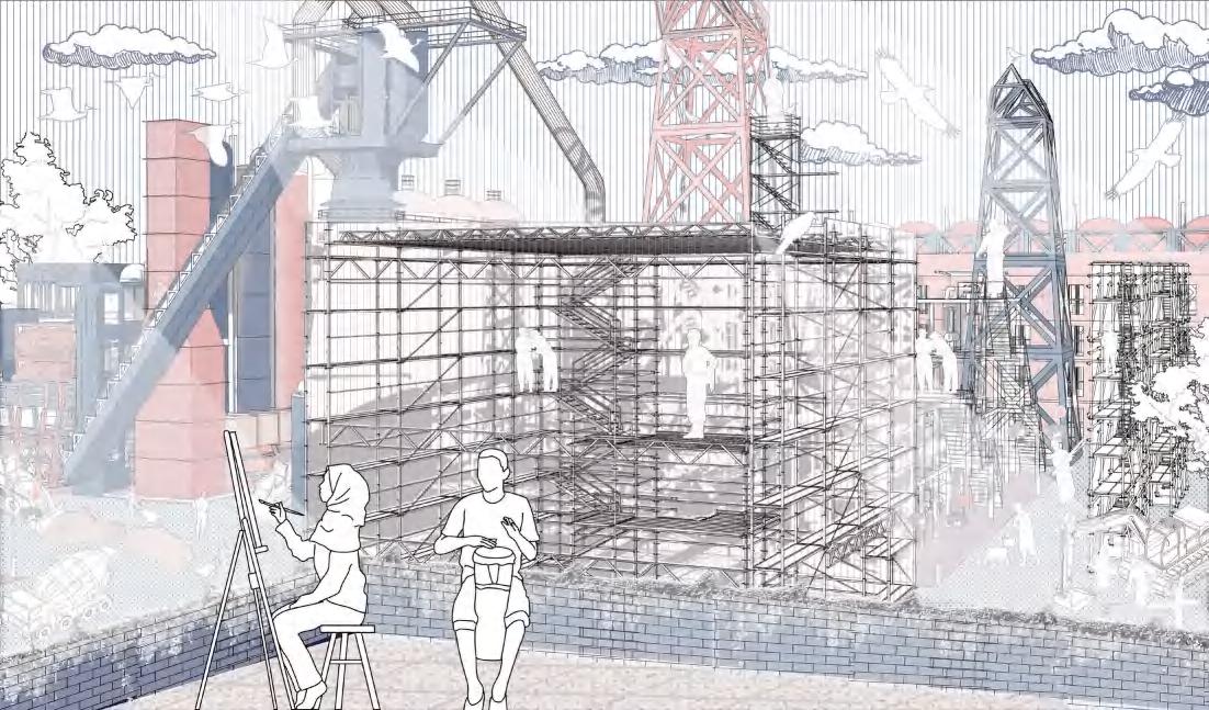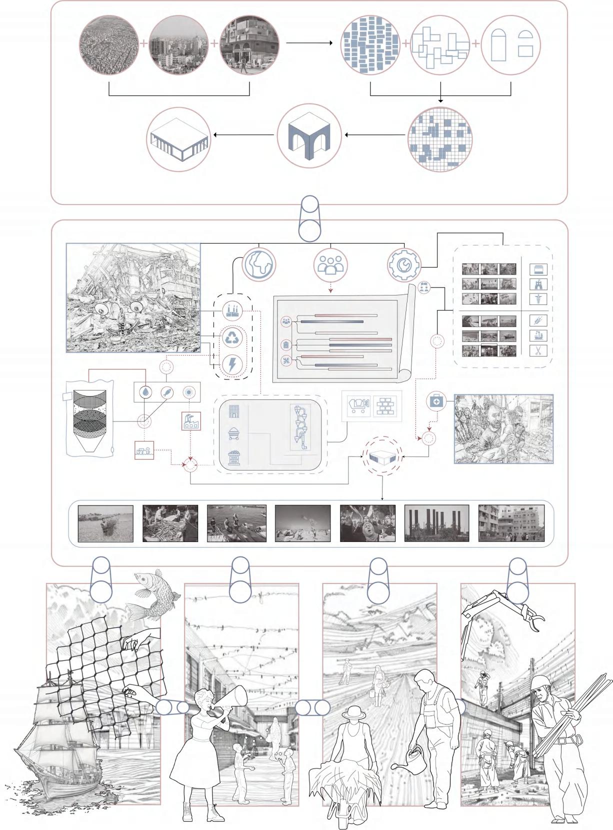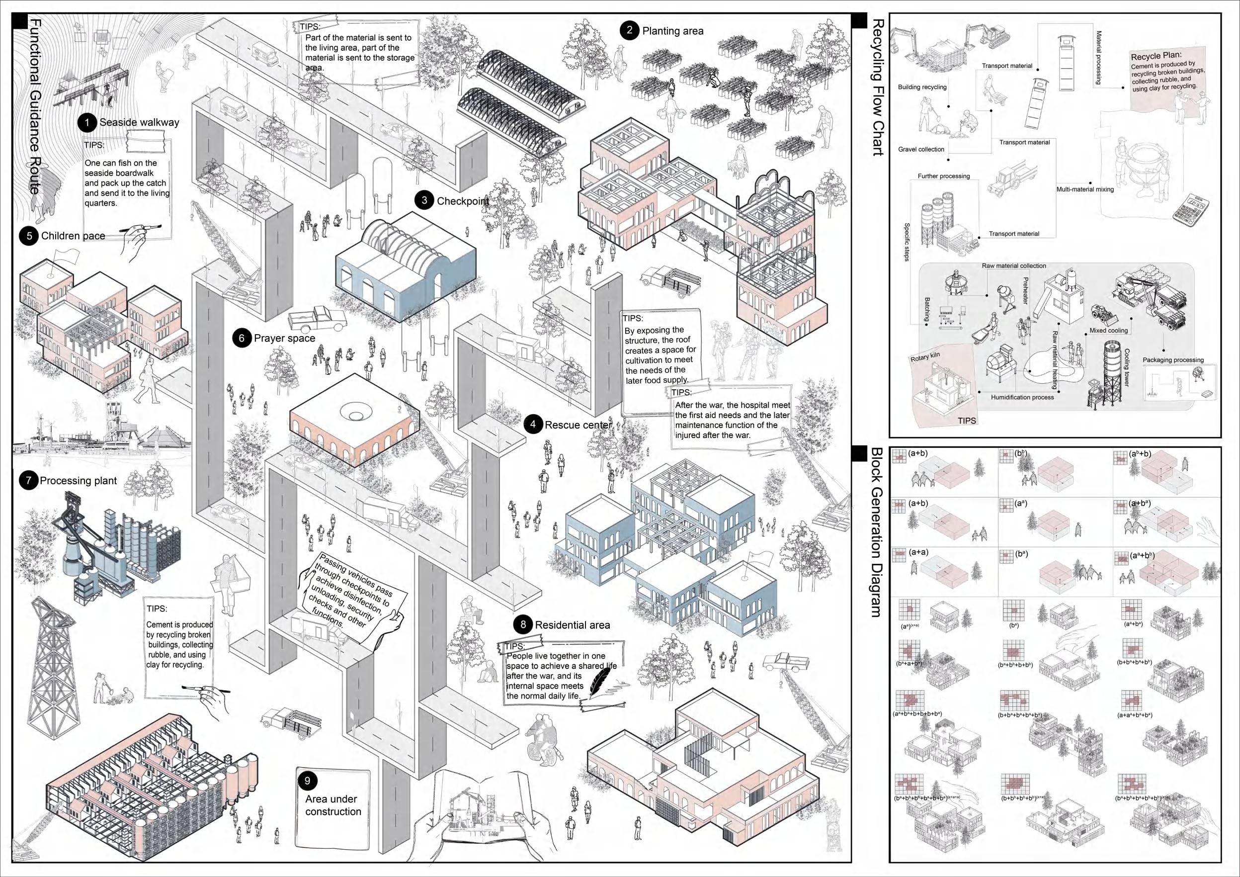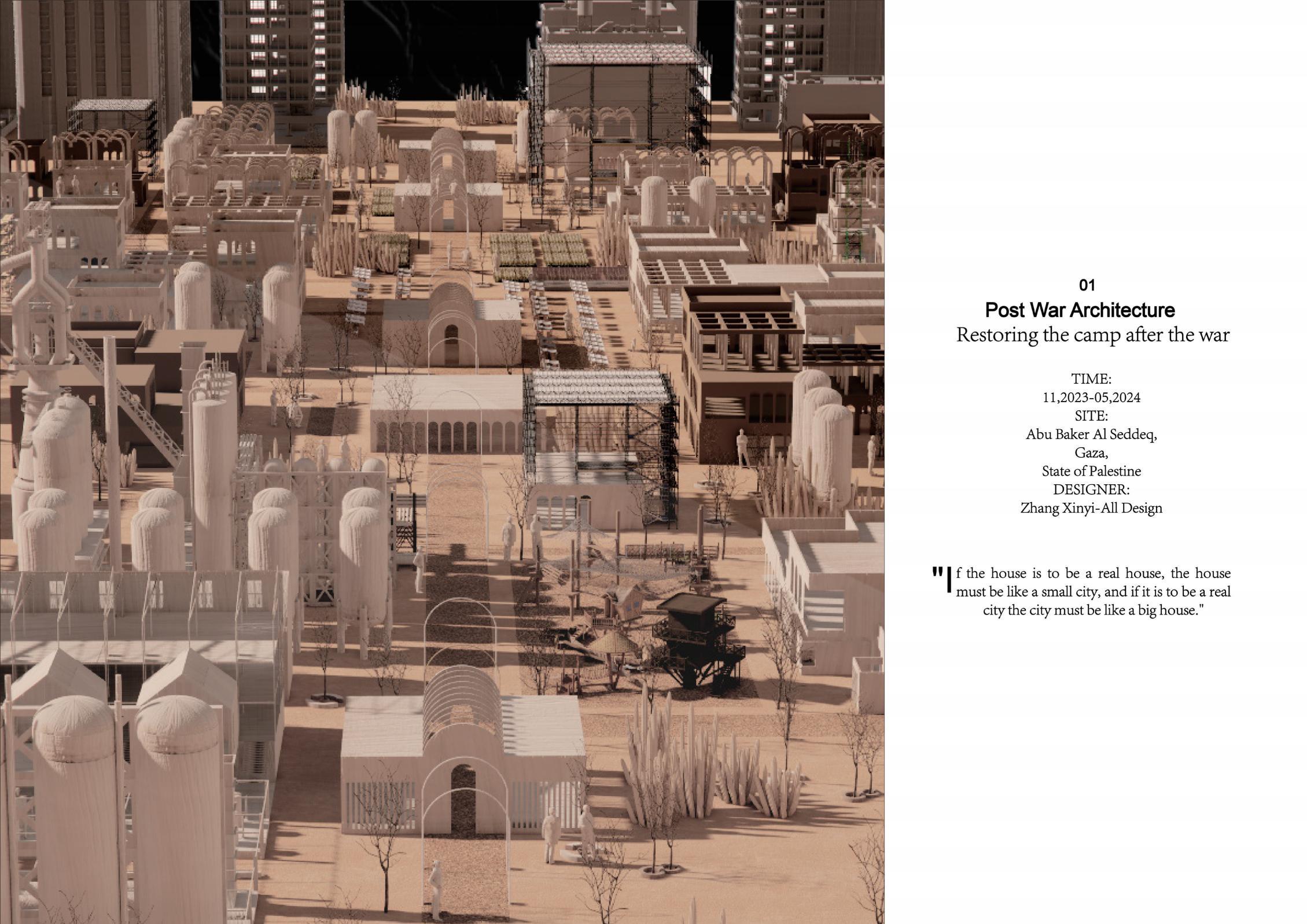 his project is a design for post-war refugee camps, focusing on rapid damage repair. It considers pre-war life, post-war changes, and human needs, ensuring infrastructure fulfillment