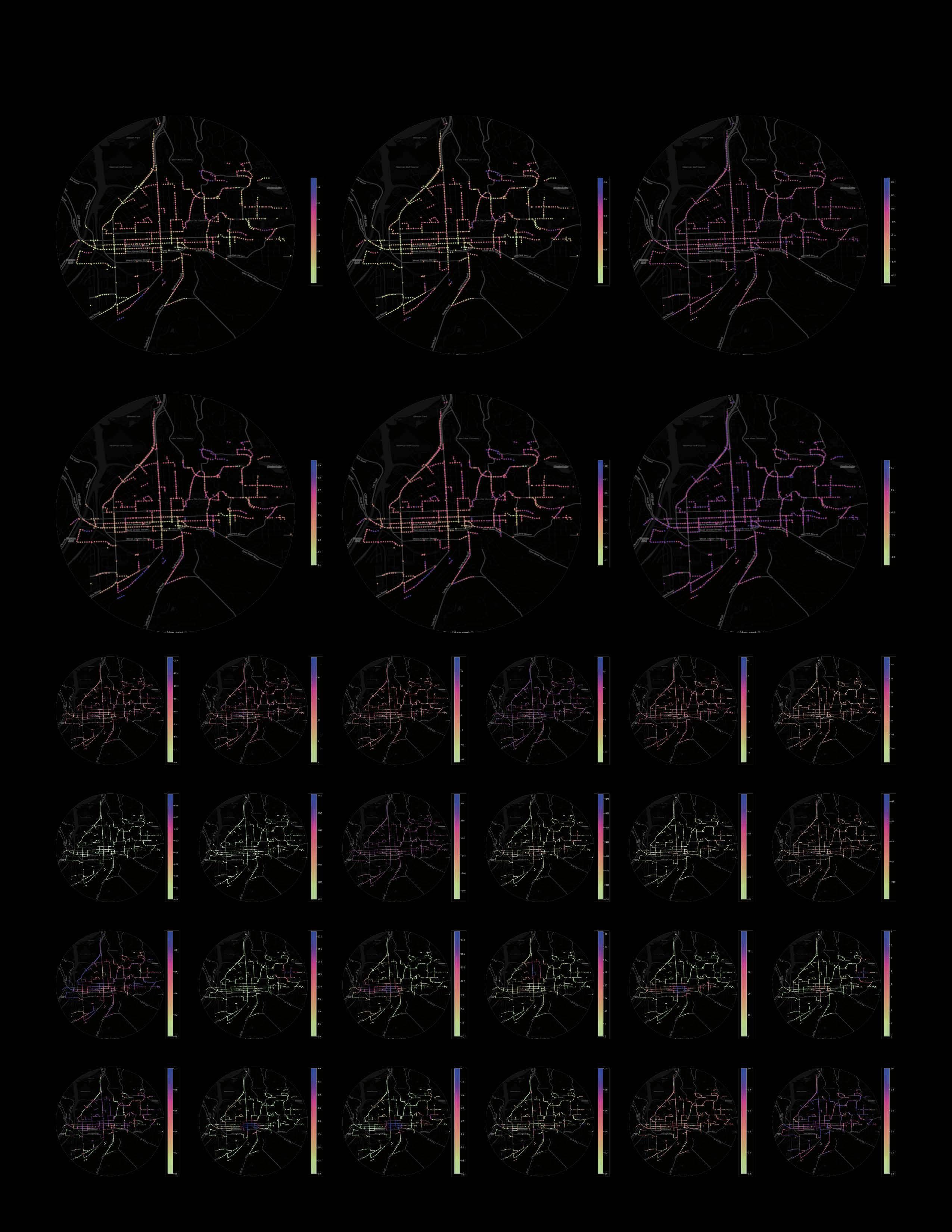 Street network, as a way to demonstrate the structure of the built environment is another aspect influencing cyclists’ behavior. After calculating the VIF we remove space syntax score with high multicollinearity (VIF>10), and finally choose Connectivity, Normalized Angular Choice (Nach), and Angular Integration (with segment length weighted, or SLW). Nach and Angular Integration(SLW) both have two radius: 250m and 1000m.