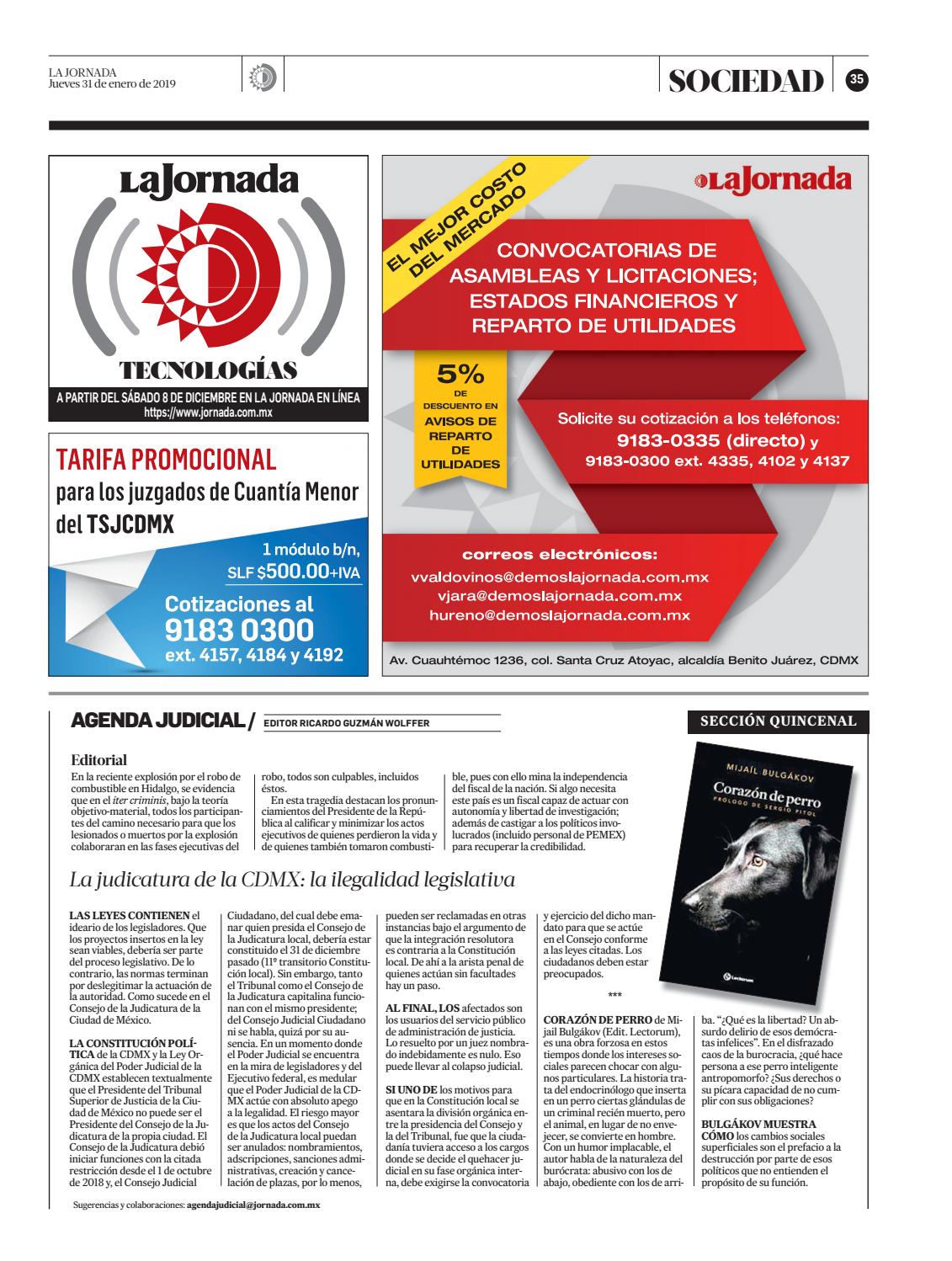 La judicatura de la CDMX: la ilegalidad legislativa LAS LEYES CONTIENEN el ideario de los legisladores. Que los proyectos insertos en la ley sean viables, debería ser parte del proceso legislativo. De lo contrario, las normas terminan por deslegitimar la actuación de la autoridad. Como sucede en el Consejo de la Judicatura de la Ciudad de México. LA CONSTITUCIÓN POLÍTICA de la CDMX y la Ley Orgánica del Poder Judicial de la CDMX establecen textualmente que el Presidente del Tribunal Superior de Justicia de la Ciudad de México no puede ser el Presidente del Consejo de la Judicatura de la propia ciudad. El Consejo de la Judicatura debió iniciar funciones con la citada restricción desde el 1 de octubre de 2018 y, el Consejo Judicial